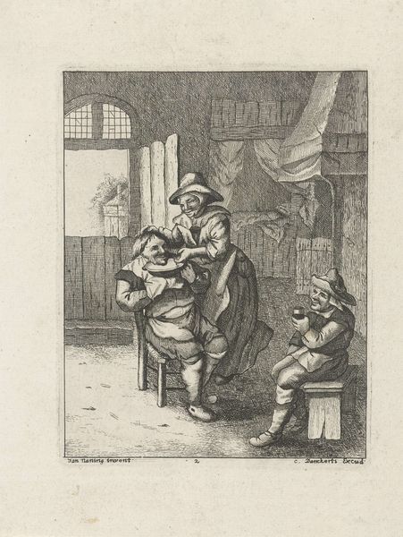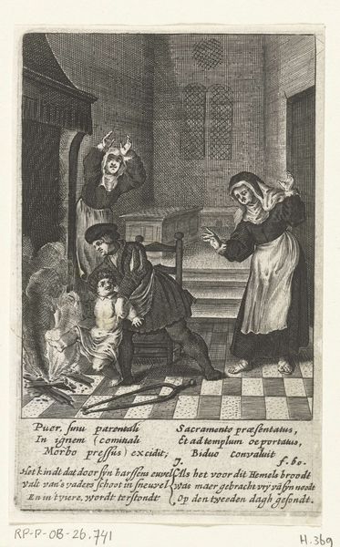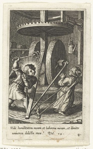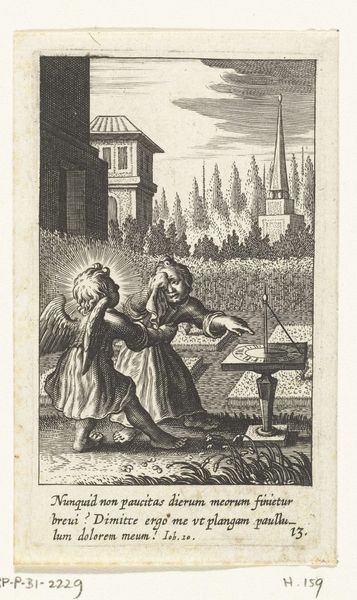 Editor: This is "Engel leert kind lopen in looprekje" by Boëtius Adamsz. Bolswert, created sometime between 1590 and 1624. It's a print, and it shows an angel guiding a child in a walking frame. It has a strangely melancholic feel to it despite the apparent act of teaching and care. How do you interpret the symbolism and the historical context of this image? Curator: That's a perceptive reading. The melancholic tone you identify might stem from the sociopolitical context of the time. Consider the function of prints like this one. They weren't just decorative; they often served didactic purposes, disseminating moral and religious ideals within a rapidly changing society. The angel assisting the child, set against that backdrop of architecture, represents not just divine aid, but also perhaps the *ideal* path for the young – guided by faith. Do you notice anything about where this scene is located? Editor: Well, there are some interesting architectural elements, a wall and some buildings with classical elements…almost like a town square that has been shut in or reduced. Curator: Exactly. That enclosed space speaks volumes. During the early 17th century, we see shifts in urban planning and ideas around public and private space. An engraving like this one might then be subtly commenting on the proper spaces for development, childhood and spiritual guidance. Editor: So, the physical setting isn't just background; it actively shapes how we should understand the relationship between the angel and the child. It makes me wonder who the intended audience for this print was? Curator: A great question. Prints were often aimed at a middle-class audience seeking affordable art that reinforced certain values, values tied into ideas about civic duty and proper behaviour in public spaces. So, the angel teaching the child to walk might be symbolic of instructing them in these societal norms from an early age. Editor: It is amazing how much history is packed into what initially seemed like a simple image. I didn’t consider the impact of urban planning on the perception of spiritual guidance, and vice versa. Curator: Precisely! Looking at art as an agent within history, we start to ask important questions about not just beauty, but influence and intent. It enriches the viewing experience, wouldn't you agree?