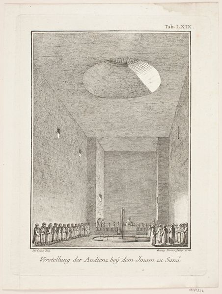 Editor: This engraving, “Interieur van moskee,” by Caspar Jacobsz. Philips, dated 1776 and held at the Rijksmuseum, offers a fascinating depiction of a mosque interior. It feels surprisingly sparse and monumental. What do you see in this piece? Curator: I see a carefully constructed visual document that engages with power dynamics and representation. The scene is rendered with a distinct emphasis on linear perspective, drawing our eye toward the Imam, elevated and centered within the composition. It is also useful to question what power dynamics existed at the time the piece was created that determined the audience and the narrative? Editor: What do you mean? Curator: Well, consider the time the print was made. How does this exterior view of a culture contrast with the way European social issues were engaged during the Age of Enlightenment? Also consider how we should confront the orientalist lens of such works today. Editor: That's a good point, particularly given that the figures seem quite uniform and maybe stereotypical in their depiction. And thinking about that architectural space, is there something more to the shape? Curator: Absolutely, consider the geometric layout of the space, how might we look at the circular skylight above, set against the rectangular interior and figures as the expression of social order versus celestial ideas. Editor: Thank you, that makes me look at this art with fresh eyes! Curator: I agree. It’s crucial to consider how artistic representation intersects with social power and historical context.
