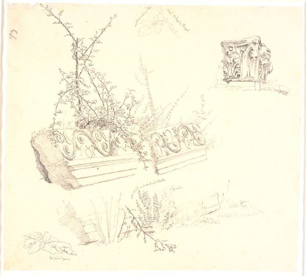 Dankvart Dreyer created "Studies of oak, buttercup leaves, etc." using pencil, pen and brush on paper, at an unknown date. Dreyer, working in the 19th century, was part of a generation grappling with ideas of nationhood and cultural identity. In this study, Dreyer presents us with a series of seemingly disparate images on one page. A landscape with trees, studies of leaves, and a partial sketch of a figure. We are invited to consider how these elements might relate to one another, or to consider the artist's process as he moves between these different subjects. This drawing provides insight into Dreyer's artistic practice and the way he was observing the world around him. How might his exploration of the local landscape relate to the broader cultural and political concerns of his time? What can we discern about his sense of place?