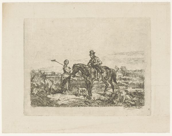 Curator: This etching by Goya, "The Cid Campeador spearing another bull," believed to be from around 1814-1816, depicts a historical figure engaged in bullfighting. What strikes you about it? Editor: It’s the sheer brutality, I think, but rendered in such delicate lines. I’m also curious about Goya's choice to use etching, a process involving acid and metal, to depict such a raw and physical scene. What's your perspective on the materials and context of this print? Curator: Considering Goya’s social standing and his commentary on the Spanish court and society, we have to consider the deliberate selection of printmaking here. How might the *means* of reproduction – etching, specifically – be a commentary in itself? Remember, prints democratize art, taking it from the exclusive domain of the wealthy. Editor: So, Goya chose printmaking, making art accessible to a wider audience while representing the bullfight, which was then a spectacle involving social classes? Was this about criticizing or celebrating popular culture? Curator: Perhaps it's both. Bullfighting provided a stage for the display of courage and skill but was also rooted in the exploitation of the animal, a theme explored by others, like Picasso, much later. Goya makes visible the labor inherent in the making of the print itself. Look at the stark lines, the areas of heavy and light application of acid. The materiality becomes part of the narrative. Editor: That makes me see the image differently, not just as a depiction of bullfighting, but as a commentary on labor, spectacle, and access to art itself. Curator: Exactly. Considering Goya's position and printmaking choices enables a materialist perspective, which is rewarding, don't you agree? Editor: Absolutely! It’s a fascinating way to see how the means of production deeply intertwine with the content and the intended audience.