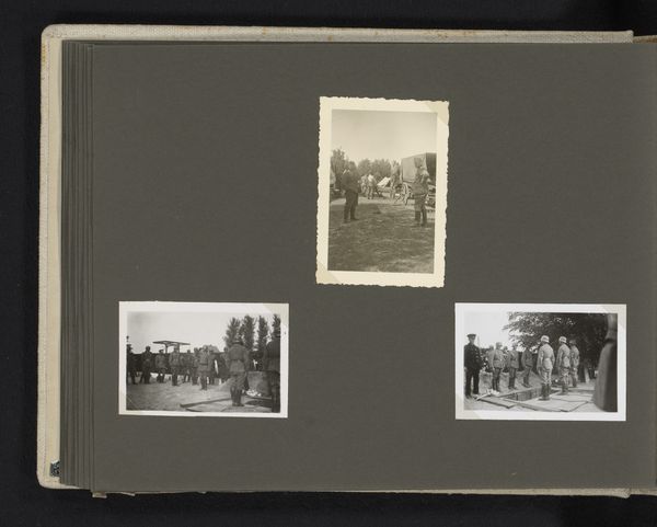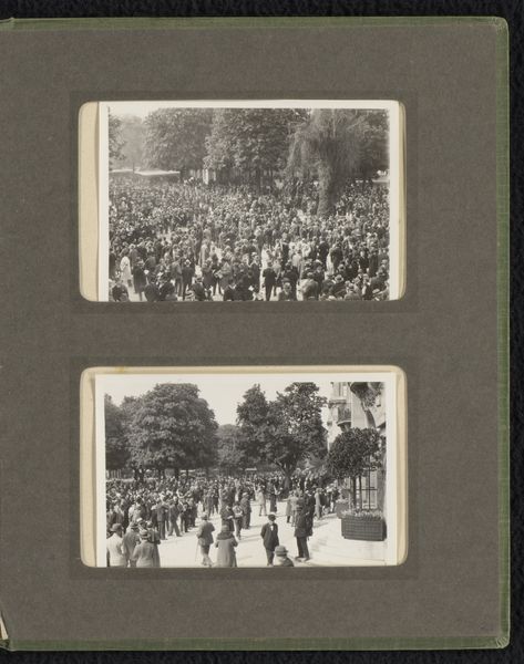 Editor: Here we have an aerial photograph entitled "Koetsen, ruiters en mensen op de Markt te Delft voor de uitvaart van koningin-moeder Emma," taken in 1934. It's a gelatin silver print, capturing what appears to be a somber event. The composition, looking down onto a packed town square, is striking. What strikes you when you look at this piece? Curator: The aerial perspective immediately positions us as observers, almost detached, yet it also provides a comprehensive view of grief made public. I see a carefully orchestrated display of national mourning – the carriages, the regimented lines of soldiers, the throngs of onlookers all contribute to a potent tableau. Notice how the monochrome tones amplify the gravity, almost stripping away any sense of vibrancy or life. Editor: It definitely feels very staged and official. What do you make of that? Is that a product of it being a historical moment being documented, or is there something else at play? Curator: Well, photography at the time was often about crafting a narrative, even in ostensibly documentary contexts. I think here, there’s a deliberate attempt to convey order, respect, and the enduring power of the monarchy amidst a personal loss. And yet, within that framework, are those individuals leaning forward, trying to catch a glimpse? Are they purely reverent, or also curious? Perhaps the photograph inadvertently reveals something beyond the official narrative, hinting at human complexities. Editor: It's amazing how a single image can hold so many layers of meaning. It really makes you think about the power of a photograph, not just to record history, but to shape it. Curator: Precisely! And to stir a whisper of human experience from beyond the archival page... it is an emotional and very striking document.