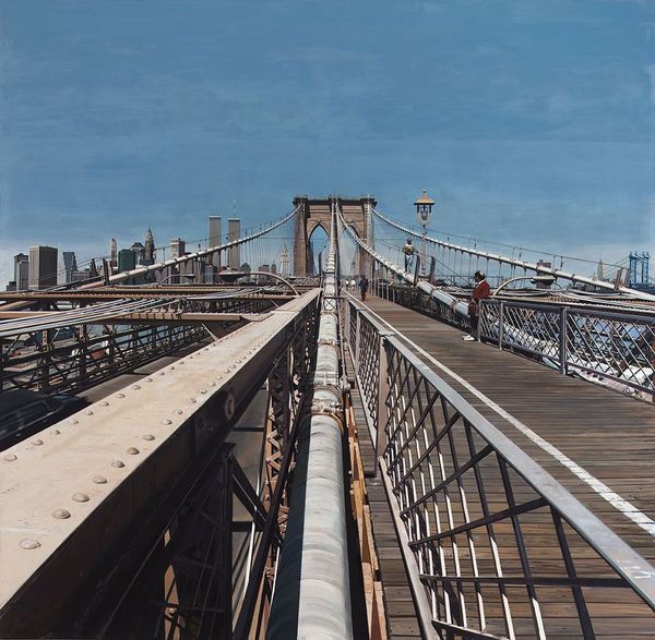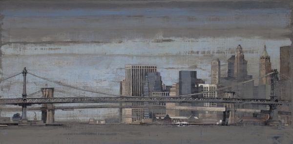 Patrick Pietropoli created ‘Times Square III’ with a painterly approach to capturing the essence of an urban landscape. I see that the brushstrokes are visible, which gives us a peek into the artmaking process. There’s a real physicality to the painting. The texture isn’t super smooth, you can see the layers and strokes where Pietropoli has built up the image. Take a look at the base of the buildings – there’s this scumbled grey area, like the city’s breath or a kind of industrial fog. The greys and muted blues create a mood that is both industrial and contemplative, it is almost a kind of melancholic scene. It's a world away from the bright lights and flashy billboards you might expect from the title. This work reminds me a little of some of the early cityscapes of Mondrian, before he went totally abstract, maybe if he’d spent more time hanging out in a dockyard. But while Mondrian was interested in deconstructing the city, Pietropoli seems more interested in capturing its atmosphere.