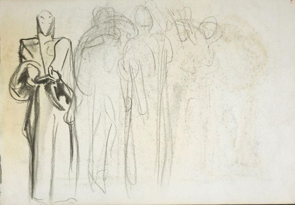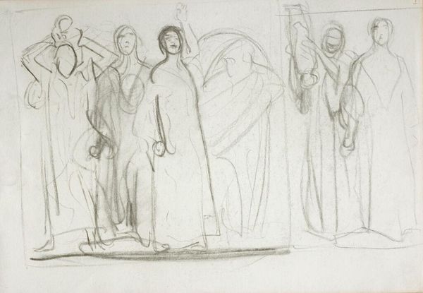 Curator: Here we have John Singer Sargent's "Study for the Frieze of the Prophets, Boston Public Library," a sketch residing at the Harvard Art Museums. It's a preliminary drawing rendered in pencil. Editor: My first impression is one of ghostly echoes, like figures struggling to emerge from a hazy dream. Curator: Indeed. Sargent was deeply immersed in researching religious iconography when preparing for the Boston Public Library commission. Look at the repetition of forms, the draped figures. They evoke the timelessness of prophetic utterance, the echo of voices through the ages. Editor: And the unfinished quality, that's key, right? It speaks to the idea that prophecy itself is never fully revealed, that there's always a sense of unfolding, of interpretation. Curator: Precisely. Sargent doesn't give us solid answers, but rather invites us into the process of seeking. The prophets, forever in a state of becoming. Editor: Well, the image has certainly left me contemplating the weight of symbols and the stories they carry forward. Curator: For me, it's a reminder that art, like prophecy, can be a form of seeing beyond the immediate.