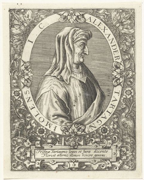 Curator: Let's turn our attention now to "Portret van Marsilio Ficino," an engraving housed here at the Rijksmuseum, made sometime between 1597 and 1669, attributed to Theodor de Bry. It immediately strikes me as rather studious. Editor: The engraving itself is incredibly detailed. You can see the textures of the clothing, even feel the weight of the paper almost, due to how expertly the material is treated, translated really, from life to ink. Was this for wide distribution? Curator: Most likely, yes. Engravings served precisely this purpose: disseminating images and ideas more broadly during that era. The formal composition, an oval portrait bust framed by ornate foliage, speaks to a Northern Renaissance aesthetic—highly ordered and symbolic. Note how the inscription hails Ficino as a “vigilant interpreter” of Plato, directly referencing his philosophical significance. Editor: Absolutely. And speaking of materials, consider the engraver's labor—the deliberate cuts into the metal, the repeated pressings. This wasn't a quick sketch. It speaks to a calculated act of making and dissemination, a process in dialogue with early publishing and, I'd argue, forms of labor that often get overlooked in studies of the period. I'm interested, too, in how the labor affects the affect of this piece; something in this man’s eye almost recognizes and reciprocates the immense labor that produced it. Curator: That is quite perceptive. There is something very knowing in his gaze. And observe the frame—the inclusion of stylized plants and creatures, echoing the themes of classical learning and humanist curiosity. They create a layered symbolic structure, drawing parallels between Ficino's intellectual pursuits and the natural world, or the world ‘outside’ his philosophical concerns, more broadly speaking. Editor: The engraving process allowed for multiples. How were these portraits received by Ficino’s readers or patrons? What’s more, were they sold as part of an assemblage or offered as an independent print, contributing further to debates of authorship and artistic labor? Curator: Fascinating questions. Ultimately, analyzing "Portret van Marsilio Ficino" invites us to consider not only its visual qualities, but its role as a cultural artifact embedded within specific systems of production and representation. Editor: Yes, exactly. By examining the material practices and modes of distribution alongside the subject itself, the portrait moves beyond a simple likeness into a node for studying culture itself.