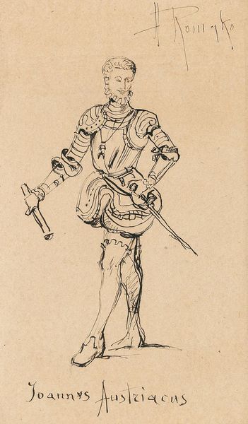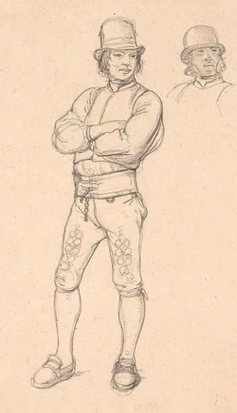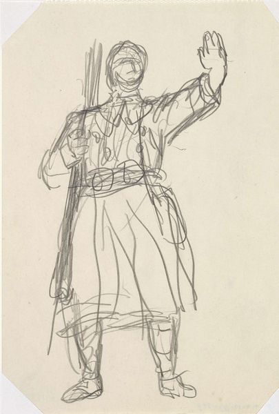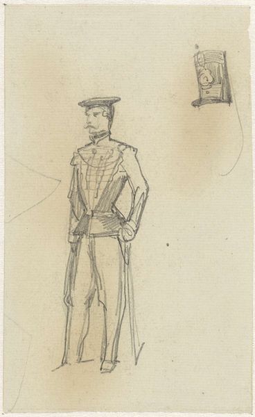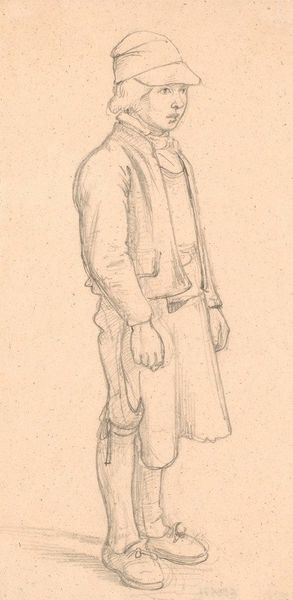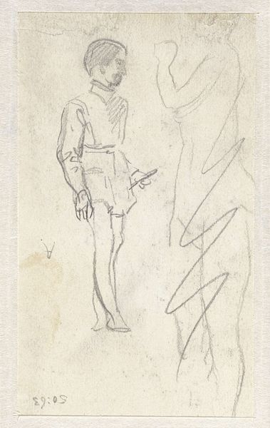 This sketch of a standing man with a hat was made by Maxime Lalanne, sometime in the 19th century. The figure emerges from delicate pencil lines on paper, with the lightness of touch and minimal shading suggesting a fleeting impression. The man's attire is loosely defined, yet the hat casts a faint shadow, indicating an interest in the play of light. The composition is structured around the verticality of the figure, balanced by the horizontal spread of the hat. The sketch favors line over mass, implying form through outline rather than volume. The transparency of the lines allows the viewer to see the construction of the image, almost like a map of the artist's thought process. Lalanne captures the essence of the figure with sparse detail, inviting us to contemplate the nature of representation itself. The drawing serves as a reminder that art’s power often lies in suggestion.