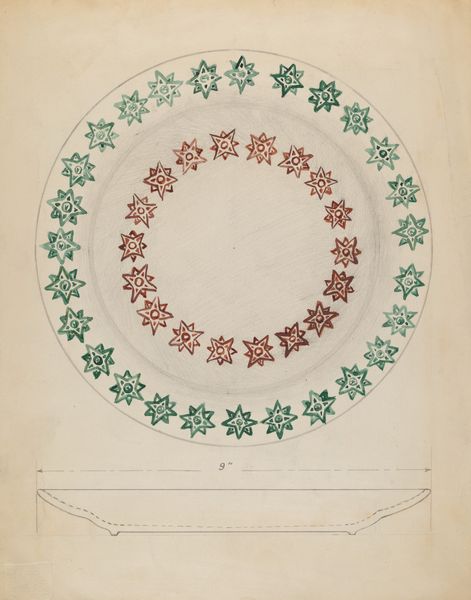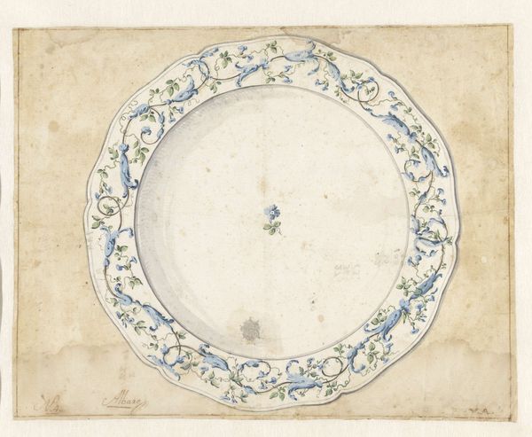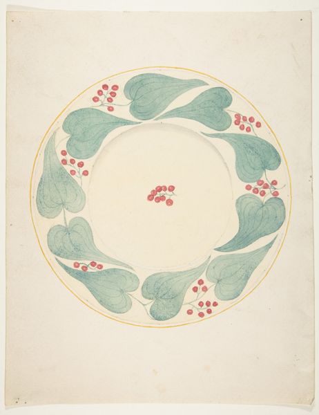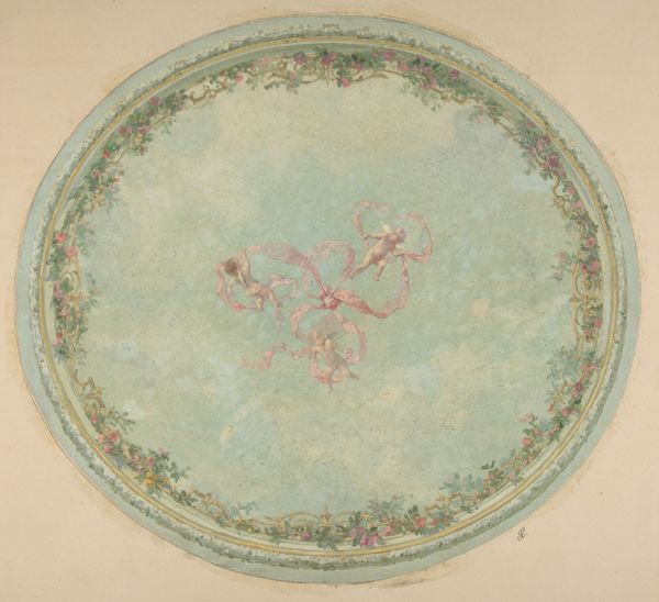 Editor: So, this is "Ceiling Design with Center Cut Out," created sometime between 1854 and 1868 by J. S. Pearse. It's a watercolor and pencil drawing. The symmetry is calming, but the empty center is a little unsettling. What catches your eye? Curator: It feels like gazing up at a forgotten dream, doesn't it? I imagine light streaming through that central void. The precision of the geometry, intertwined with the delicate floral motifs… It speaks of an era obsessed with both order and beauty. Is it a little too saccharine for our modern palates, perhaps? But think of the context. Imagine rooms aglow with candlelight, reflecting off the gilded edges. Did Pearse intend this as a purely decorative design or was there a more symbolic layer to the ‘missing’ center? Editor: A 'forgotten dream,' I like that! So you're wondering if the central void could be some sort of portal? Curator: A portal, a blank canvas onto which the inhabitants could project their hopes or status. Look how the floral details become more prominent closer to what would be the edge of the ceiling; were the decorations, those flowers, supposed to draw your eye upwards? What if it represented something deliberately left unsaid? These designs weren't merely about aesthetics; they communicated social standing, aspirations. Editor: It's funny how that emptiness can be so loaded. I initially just saw it as, well, empty. Curator: Isn't it wonderful how art does that, invites you to fill the void with your own interpretation? Maybe the empty space also is a simple space-saving approach so that people who install light are free from patterns constraints. Editor: Absolutely. It gives me a fresh way to appreciate these intricate designs. Thanks! Curator: The pleasure was all mine. Let’s wander off now into other halls.