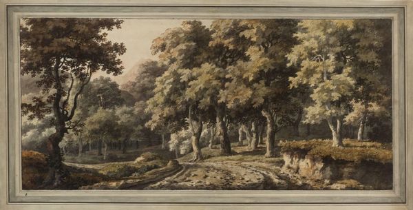 Curator: Looking at it, my first thought is, “Ah, sweet melancholy." Is that odd? Editor: Not at all. What a wistful scene. Jurriaan Andriessen created this oil painting, "Arcadian Landscape with a Temple on the Left and a Seated Old Man in the Foreground", in 1771. I find its tranquility deceptive, almost a staged peace. Curator: Staged… hmm, tell me more. It feels genuine to me, like a memory half-recalled. The soft light… almost unbearably lovely. Though I admit, something feels amiss, now that you mention it. Perhaps it's that man weeping? Editor: Perhaps. Everything in this landscape is meticulously placed to invoke very specific sentiments. The ruined temple symbolizes the past, mortality. The old man draped in classical garb seems to represent wisdom lamenting the passage of time, the loss of a golden age. See the woman, who is gently pushing forward a child as she gestures towards the statue, what could that symbolise? Curator: Hope perhaps for a brighter future, yes, but also instruction... guidance through cultural memory. Look at that ruined archway in the distance – a gateway, maybe a path out of this pensive scene and into a world, still somehow suspended, of possibilities... But it is melancholic at the core, isn't it? Editor: Absolutely, the whole scene drips with this bittersweet nostalgia. The idyllic and timeless elements blend uneasily, suggesting an impossible ideal—an idealized vision of nature, where the natural world reflects a state of mind rather than reality. Curator: It feels, ironically, modern somehow. The longing for something that never truly existed. Andriessen perfectly encapsulates that delicious ache in his brushstrokes. Like an echo in amber, preserved forever. Editor: Precisely. He creates this pocket dimension, that is at once alluring and subtly unsettling, and then allows you to feel something familiar, from some other distant land. I think it's brilliant! Curator: Beautiful. An invitation to wander into a land of wistful thoughts, a reminder to cherish both our triumphs and our losses, and perhaps... yes, an inkling of the weight carried by memories. Editor: A perfectly encapsulated world, poised somewhere between waking life and daydream.