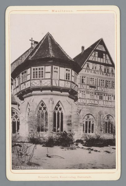 Curator: This gelatin-silver print, titled "Huis aan het Andreasplatz in Hildesheim", was captured around 1890 by the studio of Römmler & Jonas. Editor: Wow, it looks like a stage set! Stark and angular, all dark timbers and towering roof, like it’s about to tell a Grimm fairy tale. I get this uneasy, storybook vibe right off the bat. Curator: Observe how the photographers have employed a central perspective, positioning the building frontally to emphasize its architectural features. The timber framing and the steep roofline are clearly articulated, which reflects a prevalent interest in preserving and documenting historical architecture during that period. Editor: The way the light hits the different levels… it's almost like a layered cake of shadows. And the figures down below are like tiny afterthoughts, swallowed by the scale of the building. I’d wager a flock of ravens would have looked equally natural. Curator: The gelatin-silver process would have enabled them to produce prints with a high degree of detail and tonal range, allowing for the subtle textures of the wood and stone to be captured, further contributing to the image's overall clarity. It is a study in light and form. Editor: I wonder what secrets that house holds, eh? There's such a weighty silence radiating from the photograph. A stillness. It reminds me of that old saying – every stone has a story. You know, a home from home. It must have seen all of Hildesheim go by in all its seasons. Curator: Indeed. Beyond its technical qualities, the photograph is a historical artifact, providing insight into the urban environment and architectural aesthetics of the late 19th century. A document reflecting particular social concerns about urban identity and preservation. Editor: Looking at it now, the image manages to straddle both an invitation and a warning, which probably means I wouldn’t be too keen on calling to ask about residing in it. And all the more tragic because I'd wager its cellar will hold a fine selection of Rieslings. Curator: Well, looking at the formal arrangement, the print presents a stark clarity that seems typical of much commercial architectural photography from the late 19th century. A blending of technique, context and narrative I find continually compelling. Editor: Yes, it’s made me think about how much buildings are characters too—silent witnesses to our little dramas. Each stone a verse. And this house, specifically, probably remembers details most of the town forgot long ago.