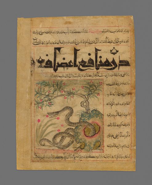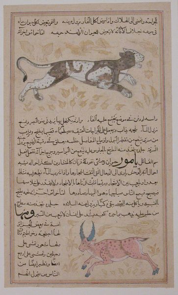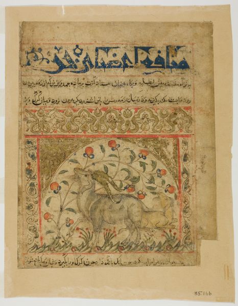 This painted page from the Manafi al-Hayavan depicts two deer amidst stylized flora and cloud forms. The anonymous artist, working in ink and opaque watercolor, has created a symmetrical composition that balances text and image. The page's structure is divided horizontally, with a calligraphic text block above an illustration of two deer, one with impressive antlers. The deer are rendered with delicate, flowing lines and a subtle palette of browns and greens. Note the cloud motifs which seem to float in the pictorial space. This arrangement invites a semiotic reading: the text, functioning as a symbolic system, anchors the image, and the stylized flora and fauna serve as signs of the natural world, mediated through cultural and artistic conventions. Together, text and image construct a layered narrative, where visual and linguistic elements intertwine. The interplay between the detailed rendering of the natural elements and the symbolic use of script challenges the viewer to negotiate between observation and interpretation.