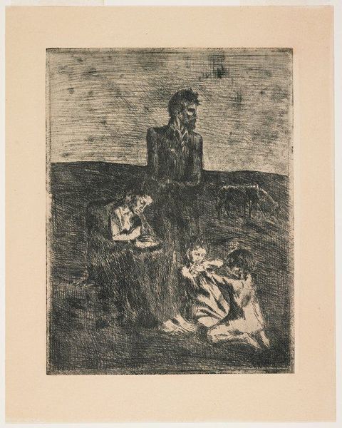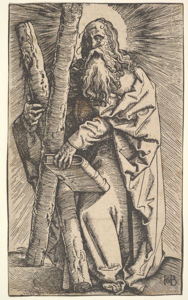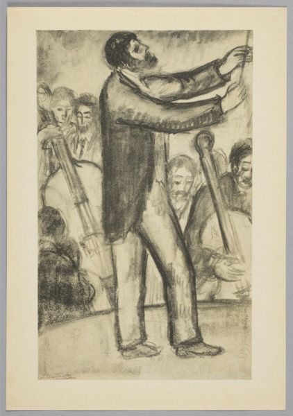 Editor: This woodcut, titled "Street Meeting," was created in 1943 by Leopoldo Méndez. I find the high contrast between light and dark creates a dramatic atmosphere; it’s very visually striking. What elements of the composition stand out to you? Curator: The dynamism of this piece is undeniable, created not only through stark contrast but also through line. Notice how Méndez uses rhythmic, almost vibrating, lines to define form and space. It almost feels like you can hear the energy of the crowd, doesn't it? Observe, too, the foreshortening of the figures in the crowd and their almost caricatured faces. Editor: Absolutely, the way he renders the faces is particularly captivating! The faces of the crowd on the left appear deeply concerned, but on the right they’re almost like shadows. What’s your reading of that contrast? Curator: One might interpret this variance in the crowd's depiction through structuralist lenses. Look at the play between positive and negative space; the bold figure of the orator is positioned against swirling lines evoking the emotional fervor in his voice. Méndez is manipulating perspective and line to orchestrate meaning within the composition. Editor: That's a great point. The visual weight of the orator against that chaotic background gives him a very heroic stature, despite the simple lines of the medium. Are there other elements of formal analysis we should consider? Curator: Consider the materiality itself – woodcut as a medium often lends itself to strong graphic elements. What kind of texture would we expect, given Méndez's tools? Editor: The final impression reveals the process; the bold cuts almost vibrate, giving energy to the message. Thanks to your insight, I view this now not just as a political statement, but as a masterful example of form driving content. Curator: Precisely. A study in visual mechanics; a brilliant exercise of graphic space and tonal opposition, effectively harnessed for socio-political expression.