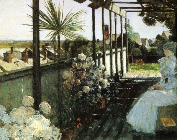 Curator: Here we see "Garden of the house of Fortuny," an oil painting by Mariano Fortuny Marsal. Editor: It’s wonderfully tranquil! The impasto brushstrokes capture the sunlight beautifully, almost shimmering on the leaves. Curator: Absolutely. Fortuny, a Romantic painter known for his genre scenes and landscapes, applied plein-air techniques here, moving his easel outdoors to directly capture the light and atmosphere. Look closely at the variety of greens he mixed. Editor: The red parasol carried by the figure breaks the color monotony, immediately drawing my gaze. And there’s that resting dog in the foreground - an unusual compositional decision, but perhaps Fortuny sought to elevate the everyday in contrast to depictions of aristocracy or mythological stories popular at the time. Was he perhaps also pointing at the performative roles for women in society, shielding themselves under the artificial construction of a parasol? Curator: That is very interesting; from a material perspective, consider the labor involved in producing such finery versus, say, the creation of simple earthenware pots scattered around the garden. There is a very different sort of work that went into each and which would've also been perceived differently by various strata of society in the late 19th century. Editor: That division is echoed in how Fortuny positions the woman in this painting; separated from nature by the cobblestone ground and her manufactured clothing. This makes me wonder, what conversations are these objects enabling – perhaps subtly critiquing consumerism? Curator: Indeed. This painting presents a study in contrasts – nature versus artifice, labor versus leisure, the raw materials versus manufactured objects that make the whole space an exercise in material negotiations. Editor: Fortuny encourages reflection on more than surface appearances in this beautiful space. Curator: Exactly, from the way this scene would have been available only to a select privileged few to the labor invested in creating this carefully constructed, leisurely life, Fortuny offers up questions beyond mere pretty aesthetics. Editor: A quiet garden that resonates well beyond its boundaries.
