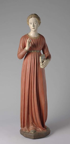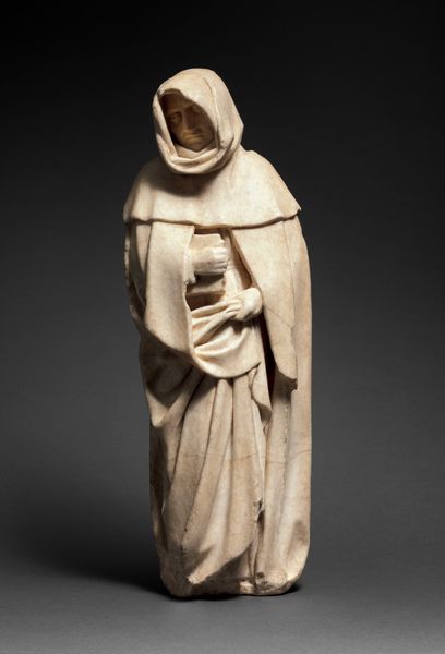 Editor: Here we have "The Annunciation," a wooden sculpture by Francesco di Valdambrino, dating back to about 1423. I am immediately drawn to the simple elegance of the figure, its creamy white surface almost luminous. What can you tell us about this piece? Curator: Well, focusing on materiality, it's crucial to remember that wood, particularly in the early Renaissance, wasn't just a neutral support. Its very nature influenced the sculpture's reception and use. Think about the labor involved in felling the tree, preparing the wood, and then meticulously carving it. What social class would have purchased this and why wood? Editor: I imagine that wood was readily available. Did its connection to craft rather than marble impact its perceived value compared to other mediums? Curator: Precisely. Wood invited a different engagement than more 'noble' materials. It allowed for a more widespread, yet also localized, production. Consider the surface treatment. The white paint isn’t just decorative. It signifies an intention, a visual experience created through layering of materials to convey its narrative. Can you imagine its purpose in that chapel? Editor: You mean it would allow the sculpture to be seen easier even in low light? I’ve never thought about it that way. I’d also guess the gold patterns imitate much more expensive woven patterns for visual enhancement? Curator: Exactly. How the labor is concealed and the way value is signified is crucial. How the artist or workshop used material to create meaning speaks volumes about art production and the marketplace then. Editor: So, the materials and their handling reveal not just the artist's skill, but also the broader economic and social context in which this "Annunciation" was created and viewed. Fascinating!