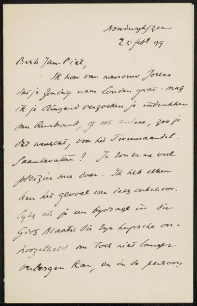Editor: Here we have "Brief aan Jan Veth" by Jozef Israëls, possibly created between 1910 and 1925. It's an ink drawing on paper, currently held at the Rijksmuseum. The handwriting itself is so expressive, almost like another layer of portraiture on top of the message. What do you see in this piece, looking beyond just the words? Curator: The handwriting itself carries tremendous symbolic weight. Calligraphy, after all, has always been linked to identity and intention. Consider how the very slant and pressure of the pen create a visual echo of the writer's emotional state. Editor: So, the script is almost performative? It reveals something subconscious about the author? Curator: Precisely! Notice how the loops and flourishes become a kind of coded language. Look closely at the signature – it is so much bolder than the more reserved script of the letter's body. The formal elements of the writing suggest something almost heraldic – think of illuminated manuscripts. What feeling does the handwriting evoke for you? Editor: It does feel incredibly personal but also distant. It’s intimate because I’m seeing his thoughts laid out, but I can’t understand the language, creating this feeling of being removed from the content. Curator: And that distance, that yearning for understanding, that’s precisely the power of visual symbols! They act as emotional triggers. What appears to be simply informational also functions as something deeply evocative. And what might it communicate to someone of that era versus now? Editor: I hadn't considered that. It's like the handwriting itself becomes a cultural artifact, laden with historical context. Curator: Indeed. And thinking about the date – early 20th century – the very act of writing a letter like this signifies a different kind of relationship, a slower, more considered mode of communication. Editor: It is more than a message. It shows deliberate construction in terms of artistry and in terms of maintaining a personal connection across distances, and now time. Thank you! Curator: It is, above all, an intimate portal.