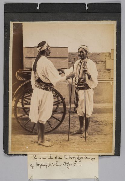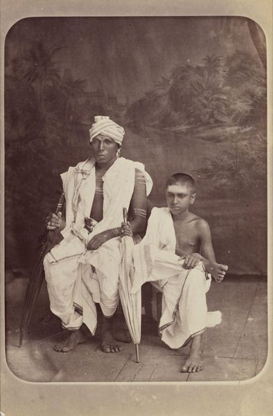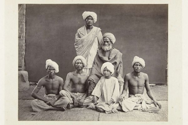 Editor: So, this photograph, "Untitled (a musician and his family)," by Willoughby Wallace Hooper, it's so striking. It's quite small, but the subjects' gaze feels very direct. What strikes you most about this image? Curator: The photograph highlights the complexities of colonial representation. Hooper, as a British officer, occupied a position of power. How might this power dynamic have influenced the image and its reception back in Britain? Editor: So, it's not just a snapshot, but a construction of a certain image, a certain narrative for a British audience? Curator: Precisely. Consider the setting, the clothing, and the objects included – were they chosen to exoticize the subjects, or to portray them in a way that reinforced colonial ideas about Indian society? It's crucial to think about the image's original context and purpose. Editor: That's a perspective I hadn't fully considered. It makes me question the stories these kinds of images tell. Curator: Exactly, and how those stories shaped perceptions and policies. It's a reminder to look critically at historical images and question their underlying assumptions.