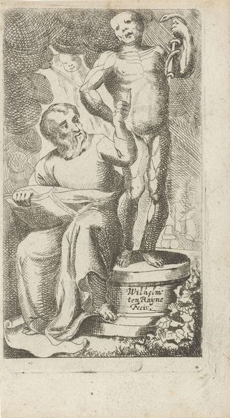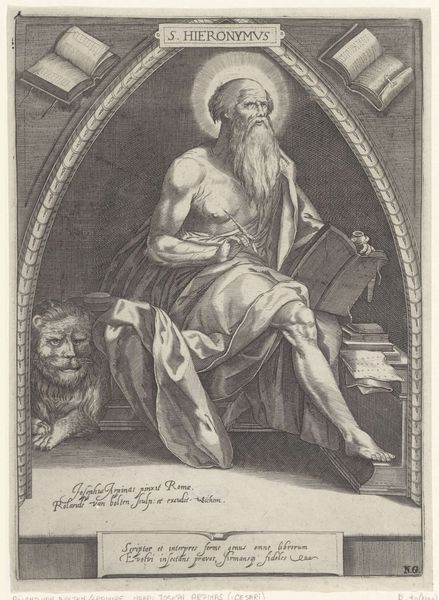 Curator: This is "Evangelist Lucas" by Abraham de Bruyn, created in 1578. The piece, housed at the Rijksmuseum, is an engraving, a print executed in ink with a pen. Editor: It's… busy. There’s a lot of visual texture crammed into this relatively small space. I am immediately drawn to the contrast between the heavily shaded areas and the precise linework. Curator: Indeed, and note the symbolic weight carried by this portrayal of Luke. During the Reformation, images of evangelists became potent statements, often reflecting specific theological leanings. Bruyn, working in the late 16th century, would have been acutely aware of these tensions. Editor: You can really see it in the cross-hatching! Notice how Bruyn uses it to define the drapery, lending depth and form to the fabrics. The light is clearly coming from above and slightly to the left. It shapes everything. Curator: Precisely, and think about how the ox at Luke's feet serves not just as his attribute, but as a loaded symbol of sacrifice, tied to ideas circulating during that period of widespread religious and political turmoil. His placement could signify the importance of sacrifice within reformation discourse. Editor: The details of the interior—the archway, the book on the desk, even the coffered ceiling—are fascinating studies in perspective, yet the artist never allows it to overpower the central figure. The lines create such balance despite the overall complexity. Curator: And, more than just perspective, consider the imagined space the Evangelist occupies and the message being communicated at a time of great transformation throughout Europe, where traditional icons of saints were being challenged or reimagined. Editor: It is a nice intersection of technical skill and rich symbolism. There’s real power in the contrasting light and shadow. Curator: It’s more than ‘nice.’ It showcases how art engaged in the vital debates about identity and devotion during a pivotal historical moment. Editor: Agreed. The image rewards closer looking.