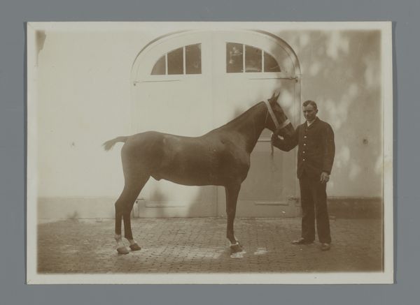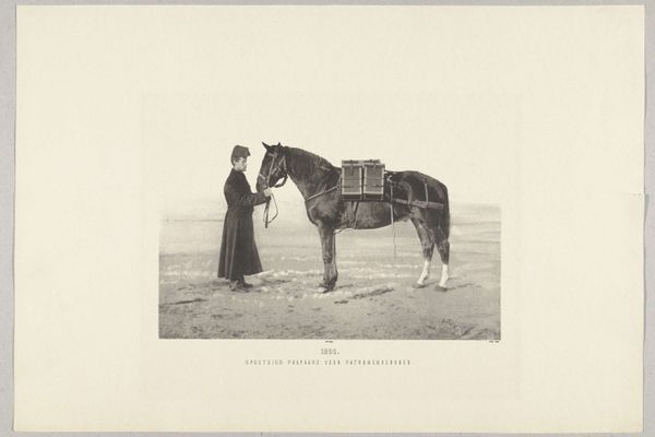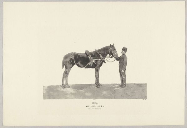 Editor: Here we have a photograph from 1895, "Opgetuigd legerpaard, en profil gezien," which translates to "Harnessed Army Horse, Seen in Profile," by an anonymous artist. It's a gelatin-silver print. There's a quietness to this image; the horse stands so still, almost posing. What do you see in it? Curator: Quiet is definitely a key word here, it really captures the stillness before... well, before potential action, shall we say? For me, beyond the horse itself – which is magnificent, stoic even – the image speaks volumes about duty and the relationship between man and animal in that context. I find myself pondering the horse's gaze. What is he thinking? Is there a sense of partnership, or simply obligation? What do you think, is he complicit? Editor: Complicit is an interesting word! I hadn’t thought of it that way. I was more focused on the visual, the texture of the horse's coat and the intricate harness. So the gaze seems to hint at something deeper. Curator: Precisely. This photo could be just a technical record, but the angle, the light... they elevate it. Don't you feel drawn into wondering about the life of this horse, the unacknowledged partner in a historical drama? Editor: Absolutely. I'm struck by how a simple portrait can become such a poignant reflection on history. Curator: Indeed. It's a testament to the power of art, even in the humblest of forms, to invite empathy and spark our imaginations, even after all this time.