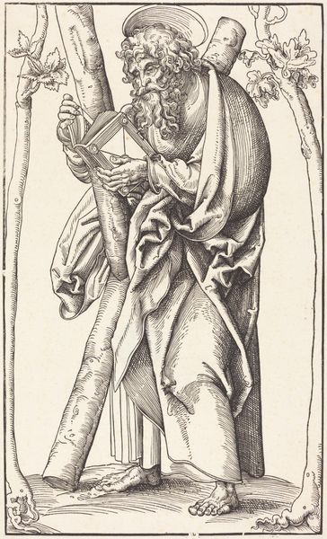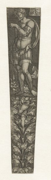Editor: This is "Sheets with Judith," an engraving by Monogrammist HE from 1529. The detail is incredible, especially for an engraving. I'm immediately drawn to the somewhat decorative, elongated format, and then Judith herself holding a head. What stands out to you? Curator: I notice how this print engages with the growing popularity of biblical heroines in Renaissance art. Think about the role imagery played then; Judith, a woman who saved her people through decisive action, became a potent symbol. Given that the print was made in 1529, not long after the start of the reformation, its production during a period of religious upheaval is worth consideration, wouldn’t you say? Editor: Absolutely. So, beyond the purely decorative, are you suggesting this print possibly served as some form of...proto-propaganda, maybe offering a veiled commentary on religious power? Curator: Exactly. Consider the act of disseminating such imagery via prints, making it accessible beyond the elite. How do you think its message might have resonated within different social strata? Would a wealthy patron perceive it differently than, say, an artisan or merchant? Editor: That's a great point. For a wealthy patron, it could be an exotic story. But if it's widely disseminated, the message gets trickier, right? Is it empowerment, warning against tyranny, or even… an endorsement of forceful actions against opposition, re-framing biblical text with new social implication? It has very distinct weight and meaning now. Curator: Precisely! Understanding the politics of imagery is key. This is less about Judith herself and more about what her image *does* within its specific cultural moment. Thinking about the social implications certainly enrich the way that the piece engages modern viewers. Editor: This has broadened my perspective, from admiring the surface aesthetic to considering its cultural and political layers! I didn't consider what its initial circulation actually signified. Thanks.
