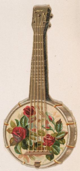 Editor: This is “Mandolin, from the Novelties series (N228, Type 5) issued by Kinney Bros.,” created around 1889. It’s a color drawing and print with watercolor and colored pencil. I find the small floral design painted on it delicate and beautiful. What strikes you about this work? Curator: Well, I’m immediately drawn to thinking about how this object, ostensibly decorative and seemingly innocuous, functions within a much broader socioeconomic and cultural landscape. Kinney Brothers were a tobacco company; these were trade cards. Considering its moment of creation, 1889, we have to ask: whose labor made this mass production possible? Editor: So, you mean, connecting it to labor history? Curator: Precisely. Think about the conditions of the Gilded Age. The source material itself reflects cultural fascinations – perhaps referencing ukiyo-e traditions in a superficial way. So, it's not simply a mandolin. It's about colonial trade, class, gendered leisure and consumerism. Editor: It's amazing to consider those themes coming together in something that seems so simple on the surface. It's like peeling back layers of history. Curator: Exactly! And by interrogating these layers, we gain insights into the complexities of our past and how they continue to shape our present. Editor: Thanks, it definitely made me think about art’s intersection with society! Curator: My pleasure. Keep questioning.