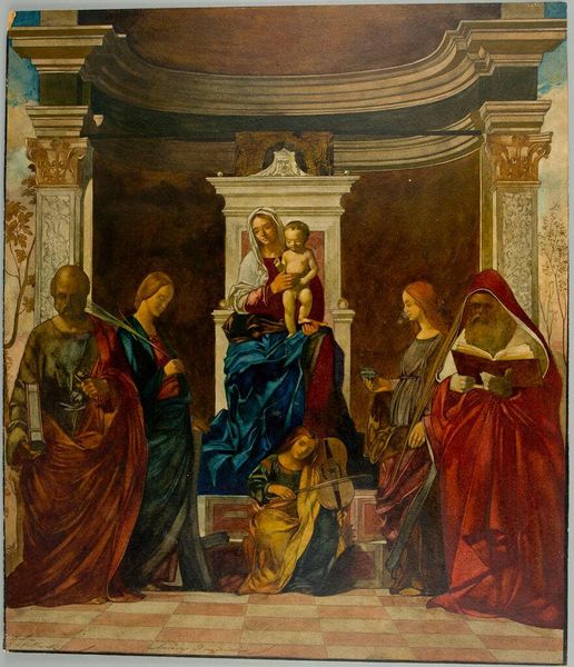 Cima da Conegliano painted this oil on panel artwork, Madonna and Child with saints, sometime around the late 15th or early 16th century. Note the prominent motif of the Madonna and Child, central to the composition, flanked by saints. The Madonna, in her traditional blue and red robes, symbolizes purity and divine motherhood. She presents the Christ Child, embodying innocence and the promise of salvation. This configuration, echoing ancient Roman imperial displays of power, evolves into a symbol of Christian authority and divine grace. Consider how this motif reverberates through art history, from the Byzantine icons to Renaissance masterpieces. The Madonna's serene gaze and the Child's tender embrace elicit a powerful emotional response, tapping into our collective memory of maternal love and spiritual comfort. Over time, the Madonna figure has undergone various transformations. In certain eras, she is a symbol of piety and submissive virtue, while in others, she is a powerful intercessor, her image reflecting the changing societal roles and perceptions of women. The cyclical progression of this image, and its emotional and cultural significance, continues to engage viewers across centuries.