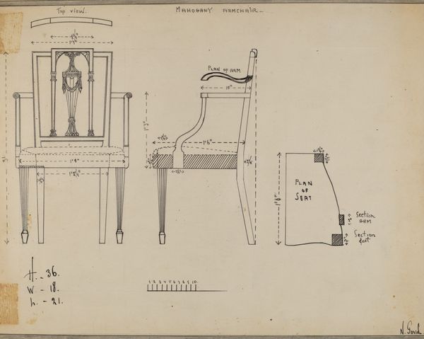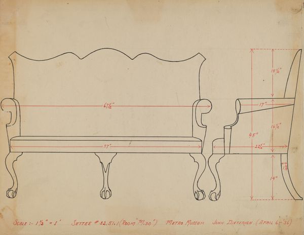 Curator: This pencil drawing from around 1939, simply titled "Sofa" by Carl Weiss, gives us an interesting look at furniture design of the period. It's a meticulously rendered study on paper, showcasing the clean lines of what appears to be a very elegant piece. Editor: My initial reaction is that it evokes a peculiar stillness. The monochrome and the precise lines make it seem less like an object for comfort and more like an architectural plan for an emotion, a formalized experience of rest. Curator: That's perceptive. Weiss employs line work characteristic of academic art, very crisp and controlled. Think of how line in draftsmanship serves a practical purpose of rendering geometric volume, versus, say, looser sketching that serves an emotional purpose. But consider what is being communicated by immortalizing, on paper, this everyday object— elevating its significance. Weiss likely sought to capture ideal proportions and style, almost as an emblem of domesticity during a tumultuous era. Editor: Exactly! It's not just a sofa; it's a statement. The sofa, presented so cleanly, implies a very structured vision of home life. Notice also the draped fabric detail up top -- garlands and swags speak of neoclassicism, yet something is stiff about it. Considering the date, as Europe was on the cusp of war, this might represent an aspiration for order amid social and political anxiety, a clinging to more 'rational' historical forms, which would likely have been consumed very differently a decade later in a period of immense postwar social rebuilding. Curator: I agree; the formal, almost diagrammatic style distances us from the tactile comfort one associates with a sofa. It transcends mere function, suggesting an aspirational vision linked to its time, which is interesting considering we are looking at the precipice of war, even the beginning. Editor: Precisely. Weiss's “Sofa” gives a lens for us to think critically about design, about what cultural dreams it once harbored, and also how the public may have consumed art or interacted with the designed world at a pivotal moment in recent history. Curator: Indeed, analyzing a simple drawing of a sofa unearths the social currents and design aspirations of the late 1930s, adding layers to how we understand this object, and the period.