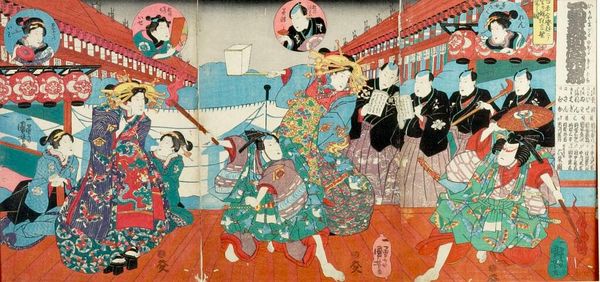 Curator: This woodblock print, attributed to Utagawa Yoshiiku, captures a "View of the NakanochÅ Niwaka Festival from the corner of Inamoto-rÅ in the New Yoshiwara." Quite a mouthful, isn't it? Editor: It is! My first thought? Total escapism, though maybe with a touch of…melancholy? There's such a contrast between the vibrant revelry outside and the languid figures in the foreground. Curator: Indeed, the women appear almost suspended, observers rather than participants. Their position hints at the complex social dynamics within the Yoshiwara district. The gaze, the power, who is really in control of it? Editor: And the festival itself? It’s a fascinating glimpse into Edo period entertainment. It’s hard not to consider this image in light of questions about gender roles and class structures. Who has access to joy, and on whose terms? Curator: It's all in the layering, isn't it? Yoshiiku invites us to consider this intricate interplay of pleasure, performance, and the underlying realities of the floating world. Editor: Agreed. It's a reminder that even moments of celebration are often steeped in complicated social and political realities. Always something to explore.