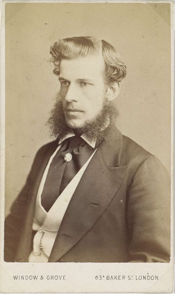 Editor: Here we have "Portrait of a Young Man," a gelatin-silver print taken sometime between 1863 and 1900 by Abraham Koorenhoff. I find the subject’s expression so compelling, almost melancholic, and it feels like looking into a past world. How do you interpret this work? Curator: Indeed, a fascinating gaze! This photograph, beyond its surface, operates as a cultural artifact laden with symbolic meaning. Notice the subject's attire, the neatly tied bow and the tailored jacket. What could that signify about societal expectations? Editor: Class, maybe? Respectability? Curator: Precisely! These details construct an image, an idea even, of aspirational middle-class identity. And the photographic medium itself contributes to this – think about the cultural weight and rapid spread of photographic portraiture during this time. Photography was no longer solely documentary, it became ritualistic. Doesn't the sepia tone lend the subject an almost romantic aura? Editor: Yes, it gives it a nostalgic feel, separating it from our present day. Are there any other visual clues that stand out to you? Curator: Observe how his direct gaze transcends time, inviting speculation about the hopes, dreams and anxieties he might have held. Doesn't that simple pose somehow transcend time and social status? Editor: It really does. Looking at it again, knowing some of the history, makes it more evocative. I had never really considered photographic portraits as symbols of broader social trends. Curator: That’s the beauty of art, isn't it? It echoes not just individual experience, but the collective memory we carry.