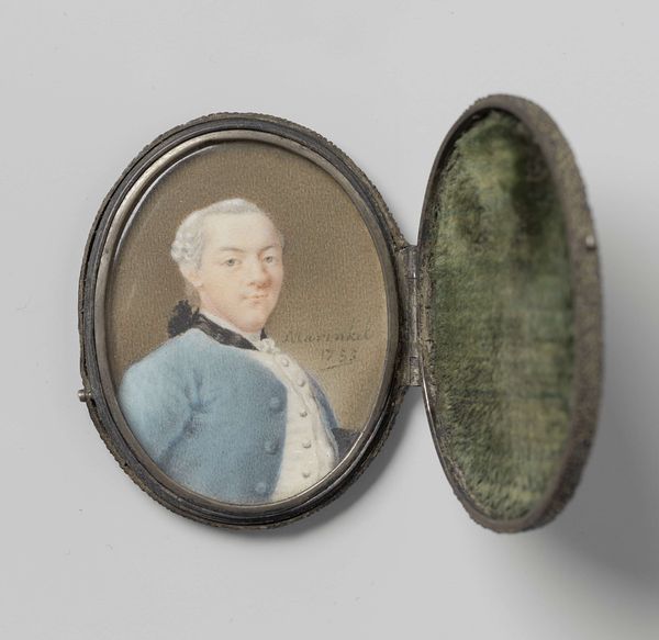 Editor: This is a "Portrait of a Man" miniature painting, from 1761, attributed to Daniël Bruyninx and currently housed in the Rijksmuseum. It's quite small, like something meant to be carried. It strikes me as formal and reserved. How should we understand a piece like this? Curator: Think about how miniatures like this functioned in 18th-century society. This wasn’t simply a personal keepsake. These objects signified status, social networks, and even political allegiances. Who do you think was commissioning or carrying this? Editor: Someone wealthy, certainly. Maybe as a gift, or something like an early social media profile? Curator: Exactly. This isn't a snapshot; it's a curated image designed to project power and gentility. Look at his clothes; what do they tell you? And what about the Rococo style—how does it fit into the social and political context of the time? Editor: Well, the clothing seems pretty fancy with the gold details on that bright blue coat, and Rococo… was that about showing off wealth and privilege? Is it designed for that audience? Curator: In part, yes. It projected wealth, but also specific values related to refinement and taste that served the political structures of the time. Miniatures could also discreetly signify political leaning, especially in eras of shifting power. This small scale enabled the quiet yet deliberate articulation of one's role in the public sphere. Now, considering where it ended up—in a museum—how does that shift its meaning again? Editor: Interesting. So it becomes an object of historical study, illustrating social and political history of that time…it is fascinating how portable objects can say so much about the larger world! Curator: Precisely! Seeing it that way helps connect the art to larger historical narratives.