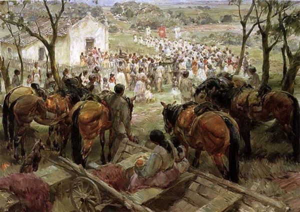 Editor: So, here we have Giovanni Fattori's oil painting, "Mary Stuart at Crookstone," created in 1861. It's a large piece and the dark figures really create a sense of foreboding, set against the backdrop of what seems to be a battlefield. What is your read on this artwork? Curator: It's important to consider the political climate in which Fattori was painting this. Italy, during the Risorgimento, was grappling with its own national identity and longing for unification. Paintings of historical figures, such as Mary Stuart, served as potent allegories. How might Mary's story of betrayal and exile resonate with the Italian experience? Editor: I guess it mirrors their struggles for independence and freedom? Mary Stuart's story wasn't Italian, so what made her a relevant figure? Curator: Exactly. The Italian public were very familiar with Romantic interpretations of Mary's plight. Fattori positions Mary not just as a queen, but also as a symbol of resilience in the face of adversity. He portrays a scene steeped in drama and rife with potential socio-political subtext. Considering the staging, what public impact do you think Fattori was trying to elicit through the dramatic landscape and military entourage? Editor: Perhaps, evoking sympathy while implicitly encouraging Italians to identify with her fight? I can see that a bit clearer now. Curator: Precisely. And remember that public displays of art are a statement in themselves. It can stir feelings about authority and collective memory. Editor: Fascinating! Seeing this artwork through the lens of Italian history provides so much context that I was completely missing before. Curator: Yes, it demonstrates how even historical dramas can speak volumes about the present, offering an artist a chance to make an appeal to the consciousness of an audience.