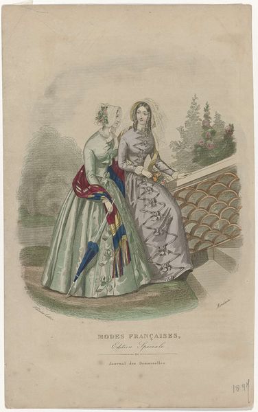 Laure Noël created this print titled 'Le Follet' in 1846, capturing the fashion of the French Second Empire. The image depicts two women in elaborate dresses and hats, embodying the era’s emphasis on luxury and refinement. Fashion plates like this one were instrumental in shaping the visual culture of the time, dictating trends and influencing societal ideals of beauty and femininity. These images offer insight into the gendered expectations of the 19th century, where women's identities were often closely tied to their appearance and social presentation. Consider the implications of such prescriptive imagery on women’s self-perception and social roles. While seemingly decorative, this print reflects a complex interplay of art, commerce, and the construction of identity in 19th-century France. It serves as a reminder of the power of images to shape our understanding of ourselves and the world around us.