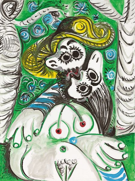 Editor: So, here we have Serge Brignoni's "Wesen 1972", a mixed-media piece with a very dreamlike, almost unsettling quality. It feels like a peek into another world, perhaps? What do you see in this work? Curator: It strikes me as an exploration of hybridity, the space between the human, animal, and the mythical, which certainly connects to its time. Considering Brignoni’s interest in Surrealism and pre-Columbian art, how might we understand these figures as challenging colonial narratives and reclaiming indigenous perspectives on identity? Editor: So you are saying it's a conscious act of cultural reclamation? Curator: Potentially. The imagery, especially the merging of animalistic and human forms, resists fixed categories. Brignoni seems to be pushing against the Western impulse to categorize and control. The juxtaposition subverts that, allowing fluidity. What social and historical conversations do you think the merging of human, animal, and possibly divine, references? Editor: Well, thinking about it, the themes of identity and challenging traditional power structures become clearer when seen through that lens. Perhaps there’s also an element of critiquing societal expectations of gender and race. Curator: Precisely. The ambiguous forms destabilize conventional notions. The vibrant, almost feverish application of color speaks to Expressionism, giving the painting even more emotional weight, which underscores those themes. Now, how might we interpret this in terms of today’s conversations on gender fluidity and intersectionality? Editor: It feels incredibly relevant. This work prompts conversations that we're still having about breaking down rigid definitions. Curator: Agreed. And understanding the art within this sociopolitical context only amplifies the power and urgency. Editor: Definitely. Seeing the piece in the light of cultural commentary adds another layer that wasn't immediately apparent.