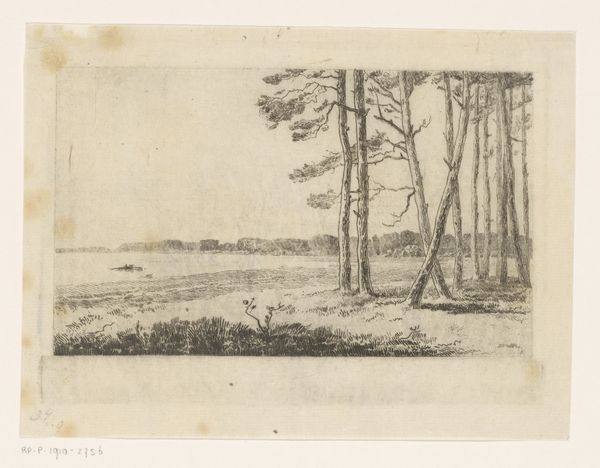 Editor: This is "Glooiend landschap bij Wolfheze," a landscape etching made between 1880 and 1884 by Carel Nicolaas Storm van 's-Gravesande. It's currently held at the Rijksmuseum. I'm struck by the way the lines create such a detailed image from such a sparse palette of shades, creating a hazy, almost dreamlike feel. How do you read the piece? Curator: Considering its materiality, this etching is more than just a picturesque landscape. I am interested in the means of its production. What kind of labor went into creating this plate? The act of etching, using acid to bite into the metal, was not simply about artistic vision. How do those productive steps and means resonate with the depicted rural scene? Editor: That's a great point. I hadn’t really thought about the labor involved in creating the etching itself, instead of the scene portrayed. Curator: Look closer, think of it as craft. The industrial revolution was shifting how both art and labor were perceived. How does etching, as a repeatable medium, participate in this moment of artistic production? Is it a rejection of mass production? Or does it democratize the availability of art through printmaking? Editor: It is interesting to see it both as craft and perhaps making art more accessible with printed editions. Is the choice of landscape significant too, as a subject reflecting contemporary concerns? Curator: Precisely. The burgeoning industrialization forced a reckoning with the natural landscape and how the value of 'nature' was changing with it, so landscapes served a significant function for many people who felt they were being taken away from rurality. Editor: So, looking at it this way makes me think about how even seemingly simple landscapes like this one carry social weight regarding industrialization at that time! Thank you. Curator: Indeed. By shifting our gaze toward the production process and historical context, we can engage with "Glooiend landschap bij Wolfheze" and begin unpacking many other elements and questions about art and labor.