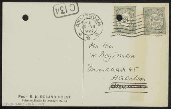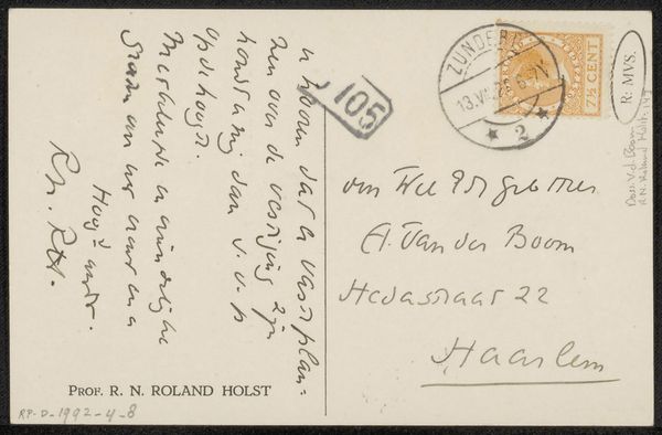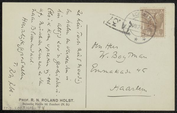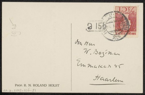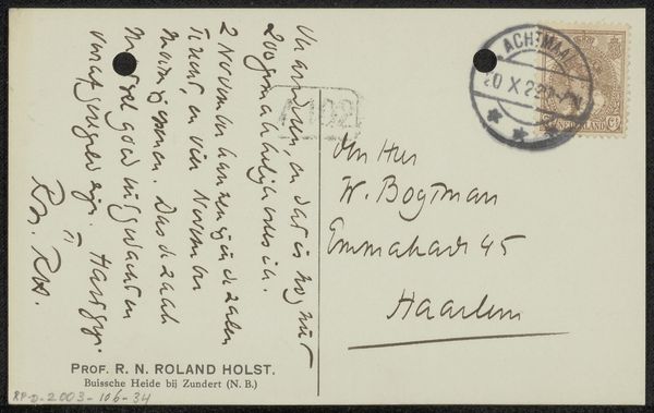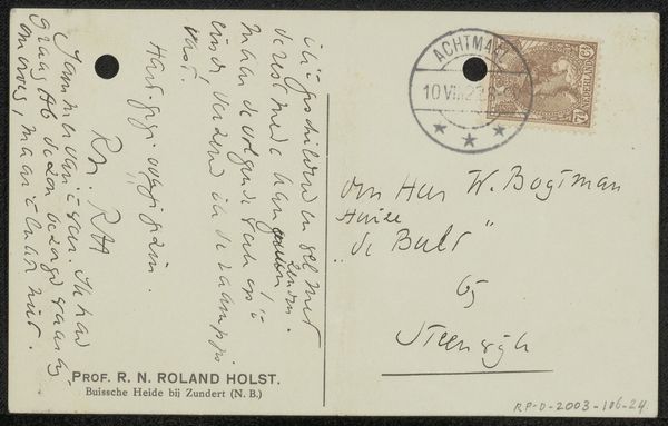 Curator: Today, we're looking at "Briefkaart aan Willem Bogtman," a postcard crafted before 1929 by Richard Nicolaüs Roland Holst. It's a pen and ink drawing on paper, and remarkably, it's also considered textile due to the nature of postcards. You can view it here at the Rijksmuseum. Editor: My immediate reaction is how personal this feels, almost like glimpsing someone's private thoughts or quick communication. It's a very humble, human object. The casual script adds a lot of character. Curator: Precisely. Roland Holst was a prominent figure in Dutch art and design, deeply involved in socialist ideals. His works often carried political and social commentary, aiming to uplift the working class. The postcard, though seemingly simple, holds an interesting place within the context of correspondence during a pivotal historical time. Editor: Absolutely. Postcards became an affordable and accessible form of communication at that time. As for Roland Holst's political commitment, I wonder, how did he see art as a vehicle for social change, and how is it embodied here? Curator: Roland Holst saw art as a tool for fostering a collective consciousness. His design work was largely oriented toward the labor movement and the distribution of knowledge to the working class. Although "Briefkaart aan Willem Bogtman" seems informal, its existence as a tool of social communication to a fellow named Willem offers clues about that commitment. And Holst's work in graphic design for socialist causes undoubtedly influenced even his most personal creations. Editor: Yes, I appreciate that insight. I find myself imagining who Willem Bogtman might have been, and how this brief message contributed, even in some small way, to a network of shared ideals or perhaps simply maintained a human connection across social stratifications. Curator: That's what makes it compelling; it’s an artifact that invites speculation about intimate interactions against a larger backdrop of social change. Thank you. Editor: Indeed, it underscores the importance of daily interactions as the fabric of social movements.