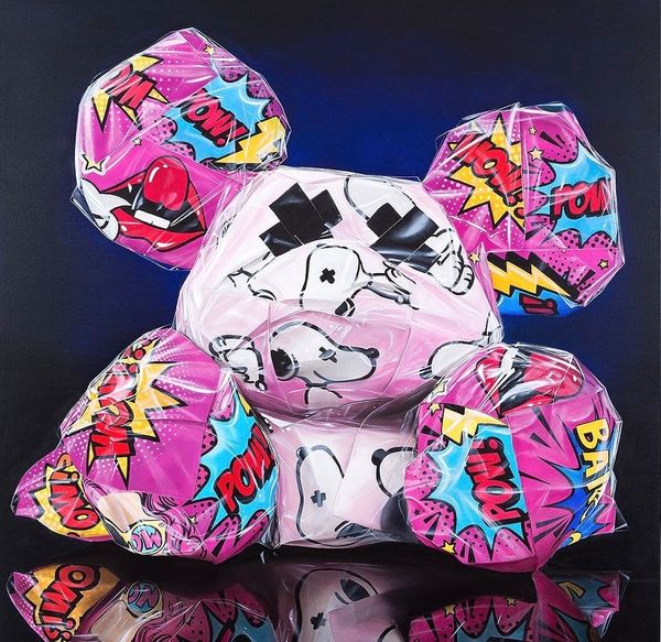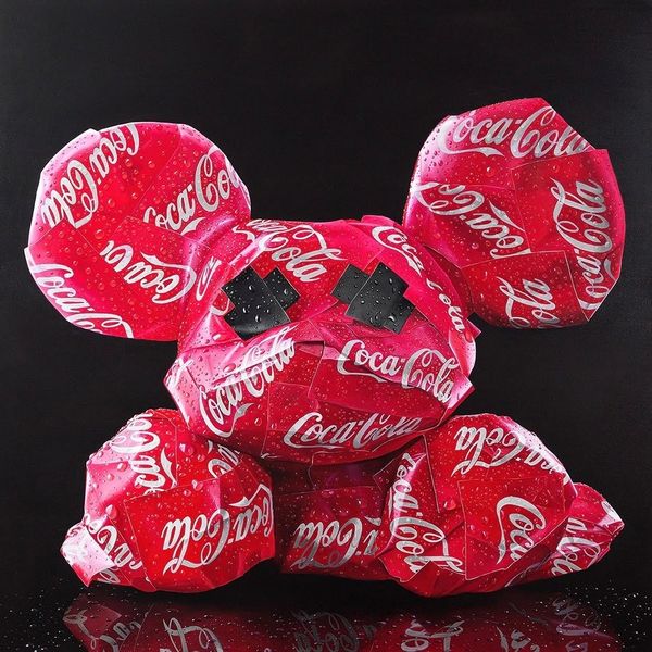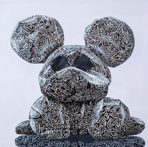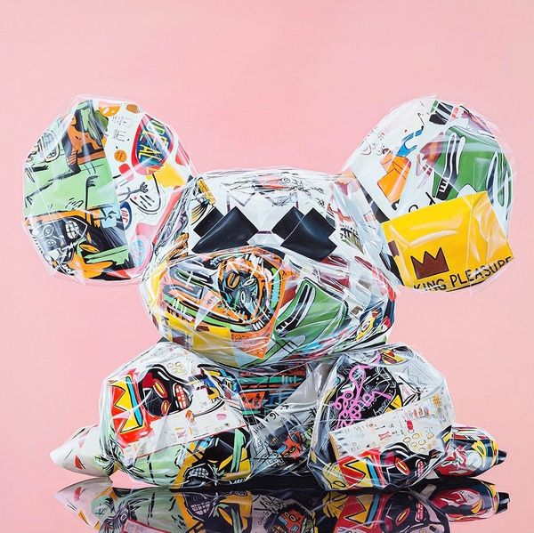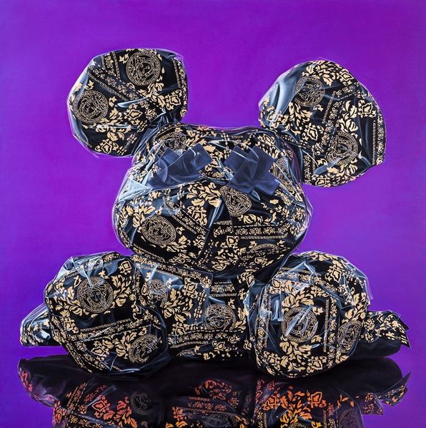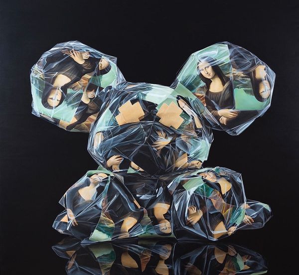 Curator: Let's explore Sergey Piskunov's "Supreme Mouse" from 2021, a mixed-media piece that incorporates photography and sculpture elements. What are your initial thoughts on this work? Editor: It strikes me as… suffocated. That glossy, packaged surface speaks volumes about materiality and consumerism, even before considering the Louis Vuitton and Supreme logos plastered all over. Curator: Precisely! Piskunov masterfully utilizes appropriation. The "Supreme" branding, combined with the luxury emblem of Louis Vuitton, immediately injects themes of consumer culture, status, and the ways in which these emblems become signifiers of identity. Editor: And the choice to depict a kind of generic cartoon mascot form also speaks to a very canny relationship between the culture industry and infantilisation of desires. It makes you think about the labor behind both creating the form, stuffing the logos into its material shell, and also our endless consumption of brands as surrogate identities. Curator: Absolutely. Consider also how the black Xs for eyes visually silence the figure, further commenting on agency within these imposed systems. Who gets a voice in this conversation? Editor: It's a stark visual choice, definitely disrupting the initial impression of playfulness with an undercurrent of discomfort. Curator: Ultimately, Piskunov's "Supreme Mouse" becomes more than just a decorative art object; it's a cultural critique rendered in glossy, marketable form, inviting viewers to reflect on the structures and values we often take for granted. Editor: Right. It presents the actual making of the art object as intrinsically linked to an implicit argument on commodity culture. A fascinating paradox in this piece. Curator: Indeed. "Supreme Mouse" offers rich insight into today's visual vocabulary and invites viewers to think about our current sociocultural obsessions through its materiality and imagery. Editor: Exactly. It makes me more aware of the ways that materiality carries ideas and arguments of its own, challenging the ways we often think about labor, product, and critique.