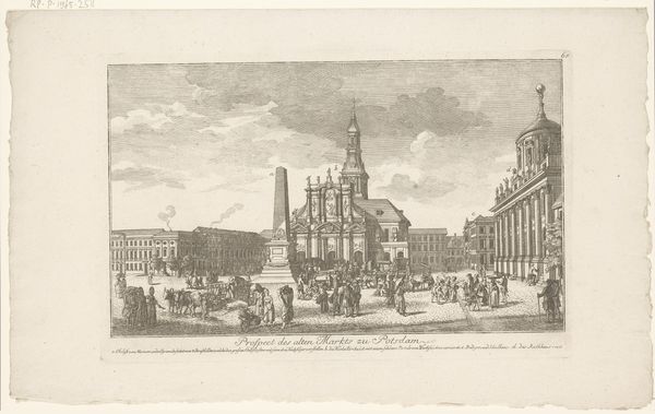 Editor: Here we have Johannes Kip's "Dam in Amsterdam," created sometime between 1685 and 1690. It’s a print, and immediately what strikes me is how bustling it is, how alive. What do you make of this depiction of Amsterdam, its architecture and all its people? Curator: I see a constructed world, teeming with signs and symbols of civic identity. Consider the buildings themselves: The New Church represents spiritual life, the Town Hall signifies civic administration and justice, while the bustling market alludes to trade, the very lifeblood of Amsterdam. Editor: That's interesting; I was so focused on the figures in the foreground that I overlooked how deliberately arranged the buildings seem. What do all these people represent? Curator: Precisely. Think of them as more than just everyday citizens. Look at their postures, clothing; they're performative. Each one embodies a facet of Amsterdam's social and economic fabric, much like actors on a stage. The image functions almost like a "how to read" Amsterdam. Editor: So, it's like a carefully curated representation of the city’s self-image, intended for public consumption? Curator: Absolutely. Ask yourself, who was the audience? Why was it important to project this image of prosperity, piety, and civic pride? Notice the clean, organized depiction – a contrast, perhaps, to the less controlled realities of city life at the time. Editor: I never thought about it that way! I appreciate your pointing out the symbolic weight of both the built environment and the people within it. This image seems much richer now. Curator: And I see that its symbols have retained their power to evoke and teach across centuries, haven't they? A conversation well begun!