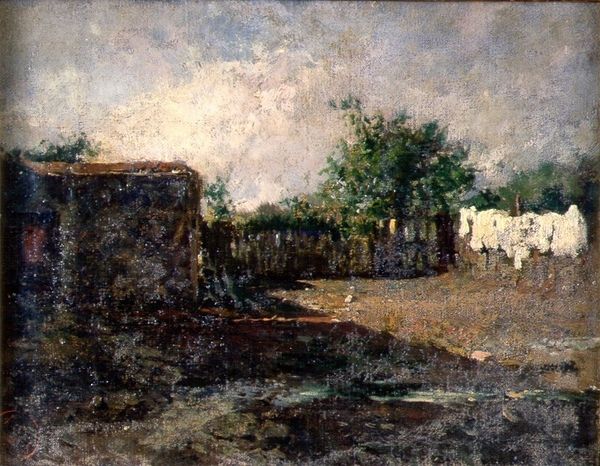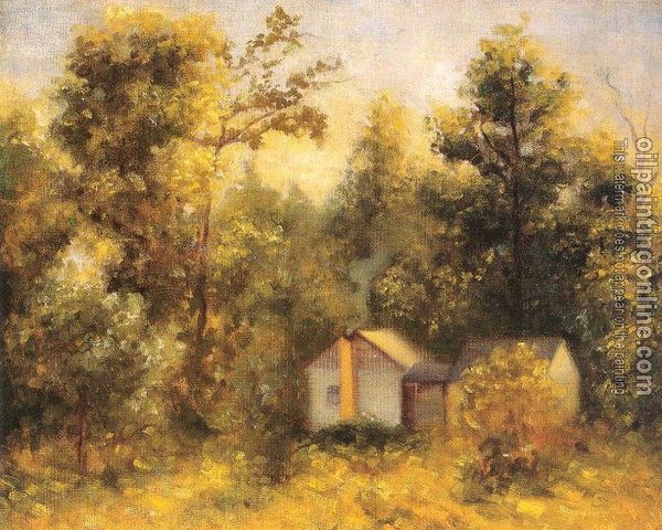 Here is the audio guide script: Painted by Edward Mitchell Bannister, this evocative landscape presents a humble abode, bathed in a warm, inviting light. The house, framed by the protective embrace of trees, stands as a potent symbol of shelter and domesticity. The motif of the home resonates deeply within the human psyche, surfacing across diverse cultures and epochs. We find echoes of this archetype in ancient Roman frescoes, where idealized villas represented harmony and order. The warmth emanating from this homestead reminds me of hearths from medieval paintings, promising solace and refuge from the outside world. Yet, the symbolism of the home is never static. In our collective memory, it morphs, reflecting societal values and personal experiences. What remains constant, however, is its powerful emotional charge, the sense of longing for a safe haven, a place of belonging that continues to haunt our dreams and shape our artistic expressions.