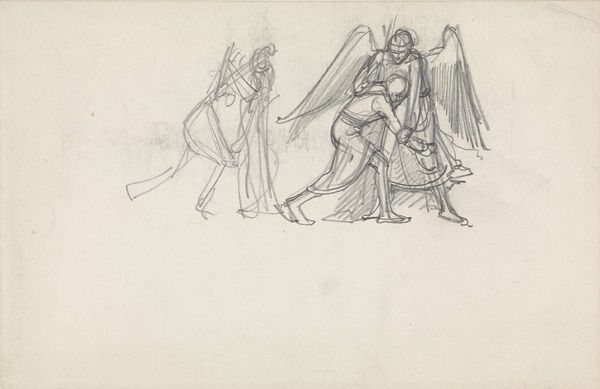Curator: Washington Allston's preparatory drawing, "Two Single Angels and Five Angels Conversing, for 'Jacob's Dream'," strikes me as delicate despite its unfinished state. Editor: There is a rawness to this work, almost like a blueprint, that is very appealing. I am really drawn to the ochre paper showing its age. Curator: Allston’s angels, rendered in thin lines, evoke a spiritual weightlessness, a sense of divine presence. The figures appear to be in conversation, suggesting a dialogue between heaven and earth. Editor: Right, this is a study, so we’re seeing Allston work through his composition. The social context here is interesting—the emphasis on the "means" feels almost rebellious to classic techniques. Curator: Indeed, we see Allston grappling with the visual language of faith, drawing on artistic traditions while forging his own path. Editor: It reveals how integral the "making of" the work is, and the artist's labor is apparent. I appreciate how it challenges the boundaries of high art by highlighting the process. Curator: Agreed, it’s rewarding to see that this quick sketch holds such symbolic richness. Editor: It highlights how the artist's process and materials really informs meaning.