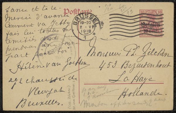 Curator: This is a prentbriefkaart, or picture postcard, addressed to Philip Zilcken. Though undated, the postal stamp indicates it was sent sometime before 1924, providing a small window into the artist’s life at that time. It looks like ink on paper, a personal correspondence, perhaps. What strikes you about it? Editor: My first impression is intimacy. Despite being a photographic reproduction, the handwriting and casual composition feel very personal, like a glimpse into a private moment. The text seems to dominate. Curator: Indeed, the text is key. Addressed to "Monk and mear, hilaken" – likely endearing terms or nicknames – it discusses travel plans, luggage worries, and general updates on the sender's activities. We must ask about the class dynamics. It reads like leisure and ease which implies both financial security and access. Editor: Absolutely. Contextualizing this postcard within early 20th-century European society reveals certain privileges assumed within the message. Who could afford extended travel and maintain connections across such distances? Also, who has servants for childcare? Curator: Exactly. Consider too the cultural landscape of the time. Zilcken himself was a Dutch painter, printmaker, and writer deeply engaged in the art world. Boasson writes to Nice with her family in tow! The act of sending art to an established man is telling of her confidence, networks, or education. Editor: Looking closer, there's a visual rhythm established by the handwritten lines, almost like musical notation. It obscures the photograph and suggests that text, context, and story hold much of the emotional weight of the picture. Curator: The postcard becomes a physical record of a social and intellectual exchange. Beyond a simple greeting, it becomes an intersectional document which weaves narratives around identity, location, class, and more. A woman writes on what it's like to go about one's daily life, but with great attention to the recipient. Editor: For me, it’s the tangible connection to a specific moment. I love that a mundane, material artifact reveals how history resides even in fleeting exchanges, beyond established archives and instead in personal stories.