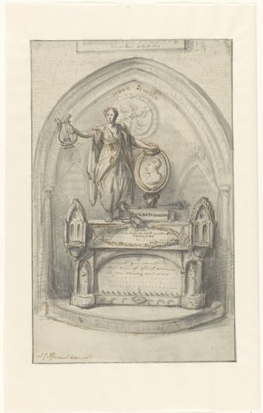 Curator: This print depicts the tomb of François de La Rochefoucauld. Created between 1645 and 1677, it's currently housed at the Rijksmuseum. Editor: It's incredibly detailed. I’m immediately drawn to the tiered construction—it suggests a grand, material statement. There's something quite assertive in the way the whole monument dominates the space. Curator: Absolutely. The baroque style emphasizes the performative aspects of mourning and commemoration. Look at the two figures flanking the top: these aren't just decorations, but represent allegories and embody complex concepts, connecting the tomb to broader philosophical and religious ideas of the time. We need to think about whose stories are told, and who gets memorialized. Editor: I'm also thinking about the actual labor and the skill involved in crafting the physical tomb that this print depicts. Who were the sculptors, the stone masons involved in building this elaborate structure? This engraving presents us with the end product, a lavish memorial, but it conceals the human toil and the materiality behind its creation. How did these artisans shape and manipulate stone? Curator: The act of translating the original physical tomb into a printed image allows us to think about its circulation and accessibility, both then and now. Who was the print intended for, what did it mean to distribute representations of elite memorials in this way? Was this about piety, politics, or perhaps something more closely linked to solidifying particular class structures and hierarchies? Editor: It strikes me that printmaking democratizes to a degree – makes visible to more eyes what once could only be seen if you visited the specific space of that Genevieve abbey. Curator: Precisely! That speaks volumes about evolving social and visual cultures, allowing us to see how narratives of power and privilege were disseminated and consumed through different material forms. It is so interesting to view today through a post-colonial lens! Editor: Agreed, looking at this image compels us to acknowledge and understand the intricate networks of labor and privilege intertwined within artistic creation and consumption in seventeenth century Europe. Curator: It pushes us to critically examine these historical modes of representation and grapple with the complex legacies they carry. Editor: And it gives weight to our appreciation for craftsmanship involved at all phases of production, in sculpture as much as engraving.