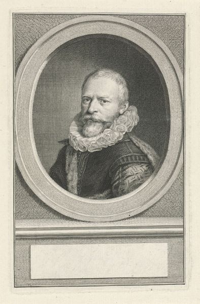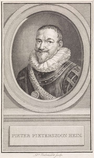Curator: Let's turn our attention to this intriguing engraving from the Rijksmuseum's collection, “Portret van Pieter Pietersz. Heyn,” crafted between 1749 and 1759 by Jacob Houbraken. Editor: What immediately strikes me is the intensity of the gaze and the contrast of textures. The meticulous detail in that ruff around his neck is astonishing, particularly considering the medium is just engraving. It's both grand and somehow quite intimate. Curator: Absolutely. Consider the history imbued in this print. It serves as a kind of proto-photograph, solidifying the legacy and social standing of Pieter Pietersz. Heyn. Think about the function it performed. It was mass-produced, yes, but also carefully constructed to present him as a heroic figure within Dutch society. The medal is a physical manifestation of his bravery. Editor: That's an interesting point about mass production, though, isn't it? Engravings made art accessible, but they also relied on highly skilled labor. The intricacy of the lines suggests hours of focused work by Houbraken, transforming a copper plate into this reproducible image. The economy of art production also shifted significantly, wouldn’t you agree? Curator: Certainly, engravings democratized access to portraiture and contributed to the construction of historical narratives for public consumption. Pieter Hein was a key figure in the Eighty Years' War; it’s not just a portrait, it’s an act of remembering his part within Dutch collective memory. It visualizes and reinforces societal power structures and heroic narratives. Editor: And yet, by using engraving, an intrinsically reproducible medium, a statement is also being made regarding dissemination. How art could spread the word of Heyn’s achievements. We’re left considering who benefitted materially from this engraving too - Houbraken or his patron? How were the printed pages traded, bought, or given away? The labour input seems a critical piece of its value. Curator: It is the intersection of access, skill and labour that creates the overall historical artefact. Thank you. Editor: Exactly! It shifts from simple portraiture to material social history.