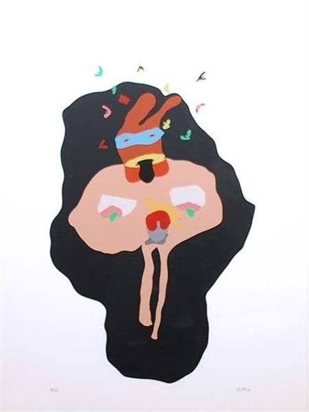 Takashi Murakami made "Melting DOB D," likely with acrylics and vibrant colors, and immediately I’m struck by how he turns artmaking into a wild, unrestrained process. The surface, with its smooth, almost digital sheen, belies the hand involved, yet those crisp lines and bold colors are so seductive. I'm drawn to the central figure with its toothy grin and swirling eyes – a symbol of both joy and underlying anxiety. The paint is so uniformly applied, that the image seems to float off the canvas. The choice of pinks, blues, and reds isn’t just playful; it’s a head-on collision with cuteness and something more sinister. Murakami reminds me a bit of Yoshitomo Nara, with a similar interest in pop culture, but he takes it to another level. It’s this mix of high and low, cute and grotesque, that makes his art so compelling, reminding us that art is a conversation, always open to new interpretations.
