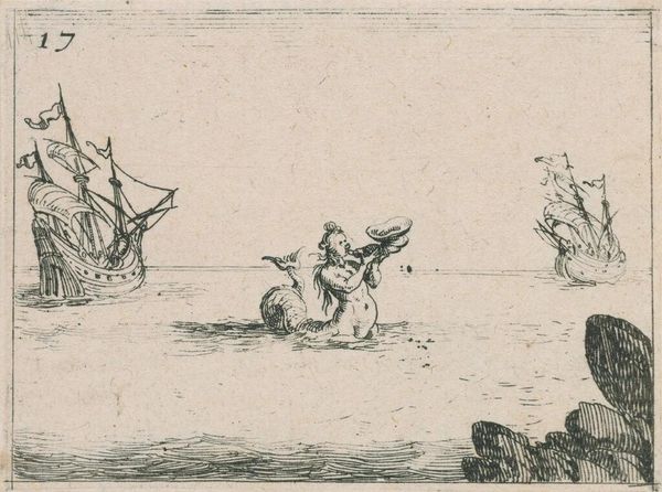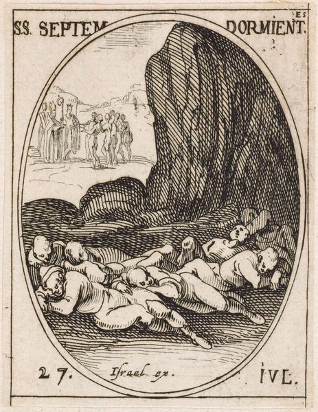 Editor: Here we have Jacques Callot's "Saint Adrian and His Companions," an early 17th-century print. It’s quite small, but the scene feels intense – a figure is being pushed off a cliff into what looks like a sea monster! What do you see in this piece? Curator: This print, though diminutive, speaks volumes about the socio-political climate of religious persecution. Notice how Adrian, haloed and defiant, is juxtaposed with the men forcing him—agents of systemic oppression. How does Callot's composition frame martyrdom as an act of resistance against the status quo? Editor: So, it’s less about religious devotion and more about resisting power? Curator: Precisely. Consider the period's religious conflicts. This image challenges viewers to question authority and consider the cost of standing against injustice. It powerfully intertwines faith and rebellion. Editor: I see that now. Thanks! Curator: My pleasure. Art gives us an opportunity to examine our values.