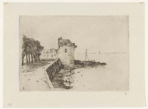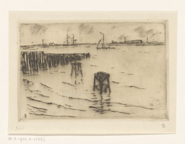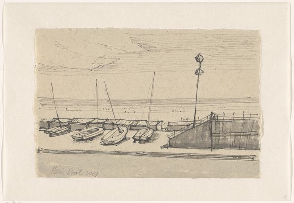 Curator: Looking at this drawing by Adolf le Comte, entitled "Wallen te Vlissingen" and dating roughly between 1860 and 1921, my first thought goes to its textural simplicity. The visible pencil strokes create a sense of rawness, an immediacy in its depiction of the Vlissingen seawall. Editor: It’s interesting how the artist chose pencil; a readily available, inexpensive material. The image evokes the industrious character of a port city, but the choice to work with accessible material elevates the everyday lives of laborers and sailors and hints at the artistic process behind capturing that social reality. Curator: Indeed. Le Comte likely produced this en plein air, documenting the ongoing development of Vlissingen’s infrastructure. It underscores the importance of such spaces in 19th and early 20th century Netherlands, which was a vital period of modernization and expansion of the harbor network. Editor: Notice how the linear elements—the palisades in the foreground, the dock extending into the sea—lead your eye, while the textures capture the aging stone fortifications. This subtle approach challenges our conventional understandings about the representation of coastal engineering during that period. Was the process of image production also meant to underscore Dutch technological and economical prowess? Curator: Potentially. But its monochromatic palette suggests more of a study— perhaps a preparatory sketch for a more polished painting, destined for exhibition in a more established salon. How an image of the Vlissingen harbor moved between studios and public galleries shaped perceptions of the space both within and outside the community. Editor: Agreed. Looking at this landscape study allows one to reflect upon Dutch society at a moment of heightened maritime activity. The drawing offers insights into Le Comte's relationship to artistic labor. Curator: And it gives us, the viewers, today a moment to contemplate a long-gone era, shaped by the material remnants visible in a single pencil stroke.