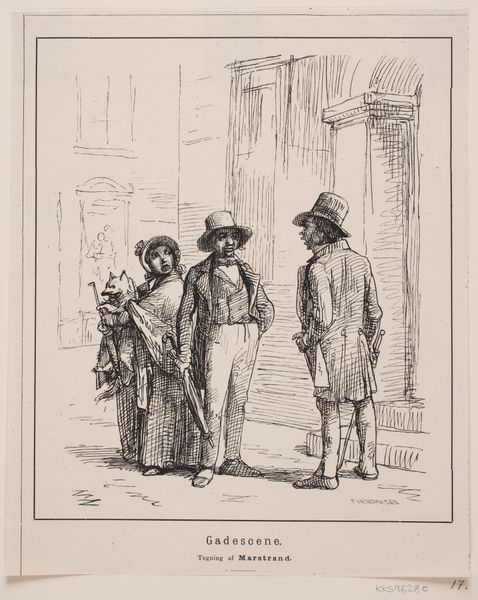 Wilhelm Marstrand made this drawing, "Et kært møde," which translates to "A Dear Encounter," with pen and brown ink. The image captures a street scene, likely in Copenhagen, given Marstrand's Danish background and the drawing's location. Consider the social dynamics at play. The older man, likely a bourgeois, escorts the young woman, while another man observes from behind. The woman appears to be caught in a moment of tension. The drawing subtly critiques social norms and the power dynamics between classes and genders in 19th-century Denmark. To fully understand this drawing, we would want to delve into the visual language of clothing and body language, the social history of Copenhagen, and the cultural expectations around courtship and class. Art history thrives when we place works like this within their complex social and institutional contexts.