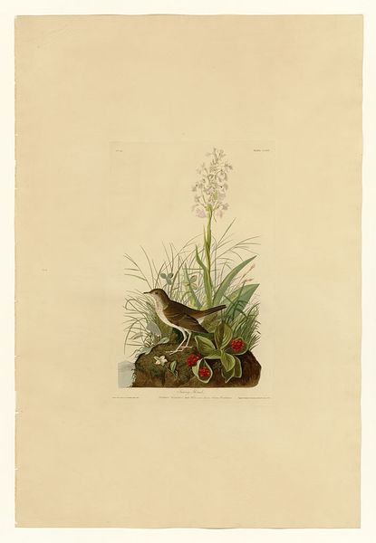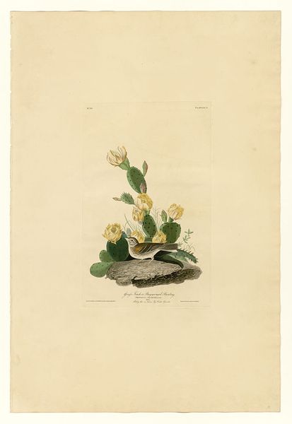 Editor: Here we have "Plate 70 Henslow's Bunting" by John James Audubon, a watercolor print depicting a small bird perched amidst foliage and flowers. It feels like a carefully constructed snapshot of a moment in nature, but also rather staged. What social narratives might have been in play when a piece like this was made? Curator: That’s a great observation. Audubon’s work gained popularity during a period of intense scientific exploration and expansion in the Americas. Consider how these images, seemingly objective depictions of wildlife, also functioned within a specific social and political landscape. What do you think Audubon was communicating about the relationship between humans and nature during this time? Editor: Perhaps there's a desire to catalogue and control nature, fueled by colonial ambitions. These birds and plants become specimens, possessions even. Does the popularity of this image speak to that attitude? Curator: Precisely. Think about who consumed these images. They were often wealthy landowners, scientists, and members of the emerging middle class. Audubon's prints were luxury items, reinforcing a sense of ownership and access to the natural world. Do you think the artistic style contributed to this sense of control? Editor: Well, the detail is remarkable, almost hyper-realistic in a way that feels very precise and controlled. Yet there's a looseness, almost a romantic sensibility, particularly in the background. Is it a blend of scientific observation and aesthetic romanticism to appeal to those specific groups? Curator: Exactly! And remember, Audubon wasn't just an artist; he was also a showman and entrepreneur. He carefully crafted his public image to align with prevailing societal values. Looking at the way Audubon framed the bird within an elegant and refined landscape, what message do you think he wanted to convey? Editor: That nature is knowable, beautiful, and ultimately, there for the taking. It makes me rethink how seemingly harmless images can reinforce specific power structures. Thank you; I have new avenues of inquiry now. Curator: And I find that your questions prompted me to reconsider how context always colors scientific visual representations.