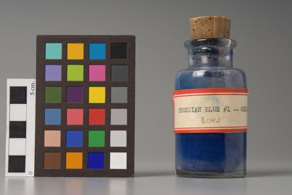 Curator: Here we have "Carmine Lake," a manufactured pigment by Fezandie & Sperrle. Editor: It strikes me as quite visceral; the glass containing that intense red powder... almost bloodlike. Curator: Carmine has a long and complex history, derived from cochineal insects; its production and trade were often exploitative. Editor: The texture of the powder is what captivates me. The color chart juxtaposed against it allows a fascinating study of the material's effect. Curator: Precisely. Its availability dictated color palettes, affecting representation and access. Who had access to which artistic materials? Editor: The formal structure here creates an interesting tension, it's a very still life with clear lines and shapes. It invites contemplation. Curator: Absolutely, and considering its cultural significance, "Carmine Lake" prompts crucial questions about the politics of color and artistic practice. Editor: Indeed. It's a potent combination of visual impact and historical context.