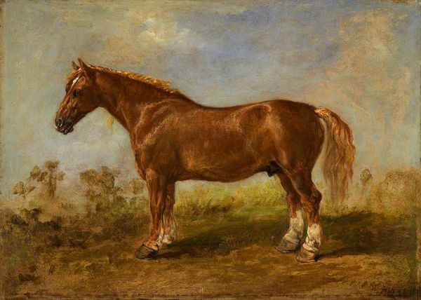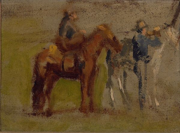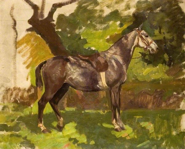 Curator: Standing before us, we have an intriguing oil painting simply titled "Horse." It appears to be rendered with a focus on realism, yet carries a sense of the unfinished. Editor: There’s an earthy quality here; the muted palette evokes feelings of quietude and rustic simplicity. I feel like I'm seeing the world through a sepia-toned lens. Curator: That's an interesting take. Consider how the positioning of the horse with its back towards us subverts traditional heroic representations. The horse becomes less about power and more about its place within a broader agricultural context. I find it to be a commentary on labor and animal exploitation. Editor: Perhaps, but for me, the absence of the horse’s face draws me toward contemplation; the lack of defined features invites reflection on its symbolism through time. Throughout countless cultures, the horse symbolizes freedom, nobility, and power. But here, that image is truncated; only the raw, burdened beast remains. What narrative implications might we draw? Curator: Its materiality is important, too. The thickness of the oil paint emphasizes a working animal’s physical form but also its tangible labor. This reminds us of the role of marginalized groups in shaping our societies, whose contributions are often obscured or simply not seen. The piece encourages us to reflect on historical exploitation. Editor: I am particularly intrigued by the presence of the saddle. A universal emblem of riding or travel; of readiness for action, but there is a strange absence of rider, with saddle just sat idly on top, the journey yet to begin. The artist draws attention to this anticipation by highlighting this loaded item with strong tones of tan. It creates mystery...What does the horse expect? Curator: You bring up a solid point. Perhaps what seems like a pastoral scene has a deeper connection to the anxieties surrounding our post-industrial relationship to nature, where human actions overshadow the labor of animals, the work they endure? The artist presents a symbol of exploitation to us in hopes of it provoking conversation. Editor: Indeed. Regardless of its intentionality, this small yet powerful canvas speaks to the enduring resonance and mutable meaning of visual symbols, their quiet potency, in communicating shared history and the complexities of human experiences. Curator: An unexpected encounter indeed, a valuable and important reflection on social issues. Editor: One that continues to inspire us.