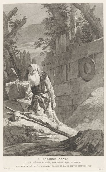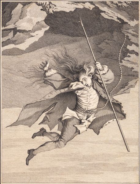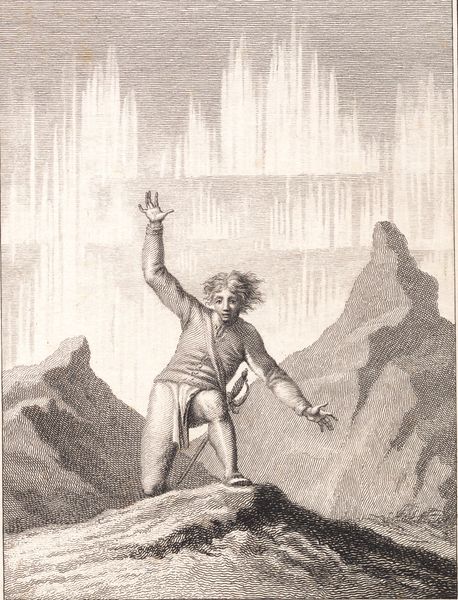 Editor: We’re looking at "Niels Klim dukker igen op mellem de norske klipper" or "Niels Klim Reappears Between the Norwegian Cliffs" made between 1786 and 1788 by J.F. Clemens. It’s a print, using etching. It feels almost theatrical – the figure emerging onto what appears to be a stage. What do you make of it? Curator: Theatrical, yes, and operatic too! The lighting is dramatic, almost absurd, shining on Niels Klim as he returns from his subterranean adventures. Do you see the sheer terror – or is it awe? – etched (pun intended!) onto his face? It makes me wonder about the nature of discovery itself. Is it always joyous, or is there an element of the frightening and unknown we have to confront? Editor: It’s definitely unsettling, his expression doesn’t read as pure joy. What’s with the weird stalactite-looking shapes looming in the background? Curator: Those spiky forms, hovering ethereally, are quite peculiar, aren't they? Perhaps they represent the unreal worlds he encountered beneath the earth – a literal manifestation of the psychological landscape he navigated. Makes you consider, what exactly did Niels *bring* back up from his travels? More than he realizes, perhaps. What do *you* bring up, surfacing in the world each day? Editor: That’s deep! I mostly think about my to-do list, to be honest. But the idea of bringing something, even unintentionally, that’s… well, it changes how I see the picture. The stalactites now seem like thoughts or anxieties. Curator: Exactly! And Clemens, through his etching, invites us to consider those invisible burdens – or gifts. Don’t forget that Klim isn't standing there for our benefit – in this instance, it's only *we* who were meant to come away having experienced something novel! Editor: It's a strange, effective, almost unnerving way to convey that. Definitely more than I expected from what I initially thought was just a historical scene. Curator: That’s the power of art – and a dash of subterranean weirdness, of course. We descend, we discover, we… re-emerge, slightly different, forever altered, into our cliffs.
