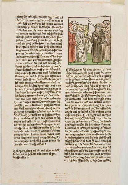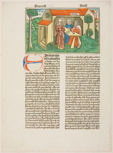 Editor: This image, "Darius Making a Decree for the Building of the Temple," is an anonymous work. It seems to be a woodcut with later coloring. The composition is really striking, with the text looming above the scene. What do you see in this piece? Curator: As a materialist, I'm drawn to the process of production here. The woodcut, the act of carving, the labor involved in producing multiple copies. This wasn't just about artistic vision, but about the dissemination of information and power structures through reproducible imagery. Editor: Power structures? Curator: Absolutely. Consider the materials: wood, ink, paper – how were these resources accessed and controlled? The printing press itself was a technology that shifted social dynamics. Is this purely a religious image, or does it also signal economic or political authority? Editor: I hadn't thought of it that way. The focus on production definitely adds a new layer. Curator: Indeed. By looking at the materials and means of production, we see how this image participates in a larger system of labor and consumption.