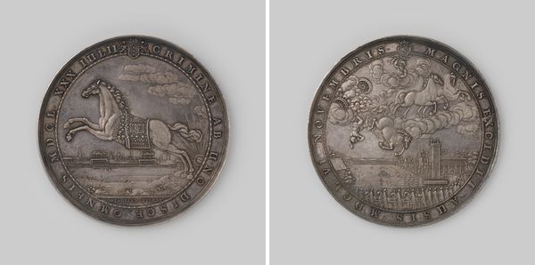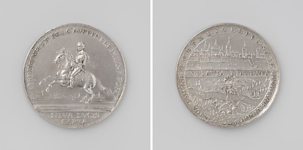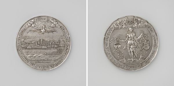 Curator: Isn’t it amazing how historical moments can be captured in such delicate objects? This metal relief sculpture, dating back to 1650, commemorates the "Siege of Amsterdam by Willem II." Editor: My first impression? It feels so contradictory – epic history pressed onto something so small, intimate almost. The detail crammed in is stunning, like a whole world etched onto a coin. Curator: Exactly. One side depicts the cityscape, that’s Amsterdam under siege. Can you see those tiny figures on the walls, defending the city? It’s an incredible miniaturization of that specific historic moment. Editor: And the reverse side shows a triumphant figure standing amidst what looks like defeated military objects, flags, and maybe a cannon? It's almost a classic allegorical representation, victory embodied. Curator: You're spot on. The standing figure, she’s likely an allegorical figure of Peace, and then we see on either sides of each, inscriptions, these slogans of patriotism that are meant to glorify, meant to unify after such a stressful event for this emerging city, at the time. What’s interesting to me is how Baroque these kinds of sculptures are – the detail, the symbolism, how it attempts to put order to reality in these kinds of metal works. Editor: And how loaded the image itself becomes. These aren't just events; they become national stories, laden with morality tales and, well, often, political messaging, like how to stay united. I also feel these works remind me that "history" always depends on the storyteller’s purpose, to create, maybe a warning, perhaps a lesson. Curator: Absolutely. Artworks such as these carry within them, the essence of those complex societal and personal events that shape history, culture and visual codes. Editor: It certainly adds a layer to how we think about this siege, to imagine its significance molded into these commemorative emblems, rather than being only on the written pages of official historic documentations.