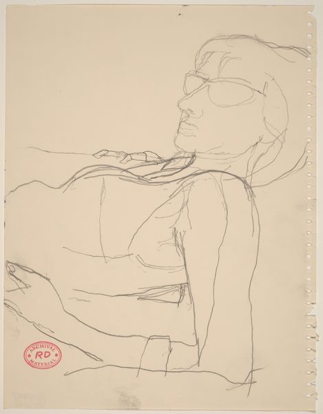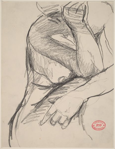 Curator: Richard Diebenkorn's "Untitled [female nude with arms raised]," likely created between 1955 and 1967, presents an evocative study in graphite pencil on paper. Editor: It's strikingly raw, almost fragmented. The harsh, dark shading around the arms contrasts sharply with the delicate, suggestive lines defining the rest of the figure. It gives a sense of internal struggle or constraint, doesn't it? Curator: Precisely. The composition certainly prioritizes form and line over precise anatomical correctness. Note the angles, the rapid, almost chaotic application of the pencil—the artist seems more interested in capturing movement and tension than a photographic likeness. Editor: I read the gesture of raised arms as an echo of classical crucifixion poses, inverted almost—a figure exposing vulnerability rather than bearing the weight of the world. There's a psychological drama implied, especially considering the Abstract Expressionist context. Curator: That’s an intriguing interpretation, and plausible considering Abstract Expressionism’s preoccupation with the subconscious. The negative space becomes crucial here. It activates the figure, hinting at surrounding, unseen forces or even inner turmoil. Editor: Diebenkorn clearly uses the nude figure as a vessel for communicating powerful, raw emotion. Even without defined features, we immediately understand the implied vulnerability in the gesture of exposure combined with shadow. Curator: Absolutely. And look at how the darkness is strategically placed. It frames and almost traps the figure, heightening this tension. Diebenkorn’s careful arrangements push us beyond mere representation to experience emotional complexities through the push and pull of artistic expression. Editor: I find the unfinished quality deeply affecting. It allows space for projection and empathy. This is more than just a nude; it is a sketch imbued with layered connotations. Curator: Agreed, it shows the sheer capacity of a simple sketch medium to convey such profundity. The interplay between the artist's line, the implied forms, and the emotional depth elevates it. Editor: It certainly makes you reflect on the symbols we attribute to the human form.